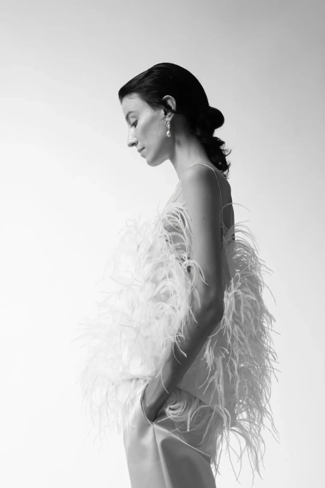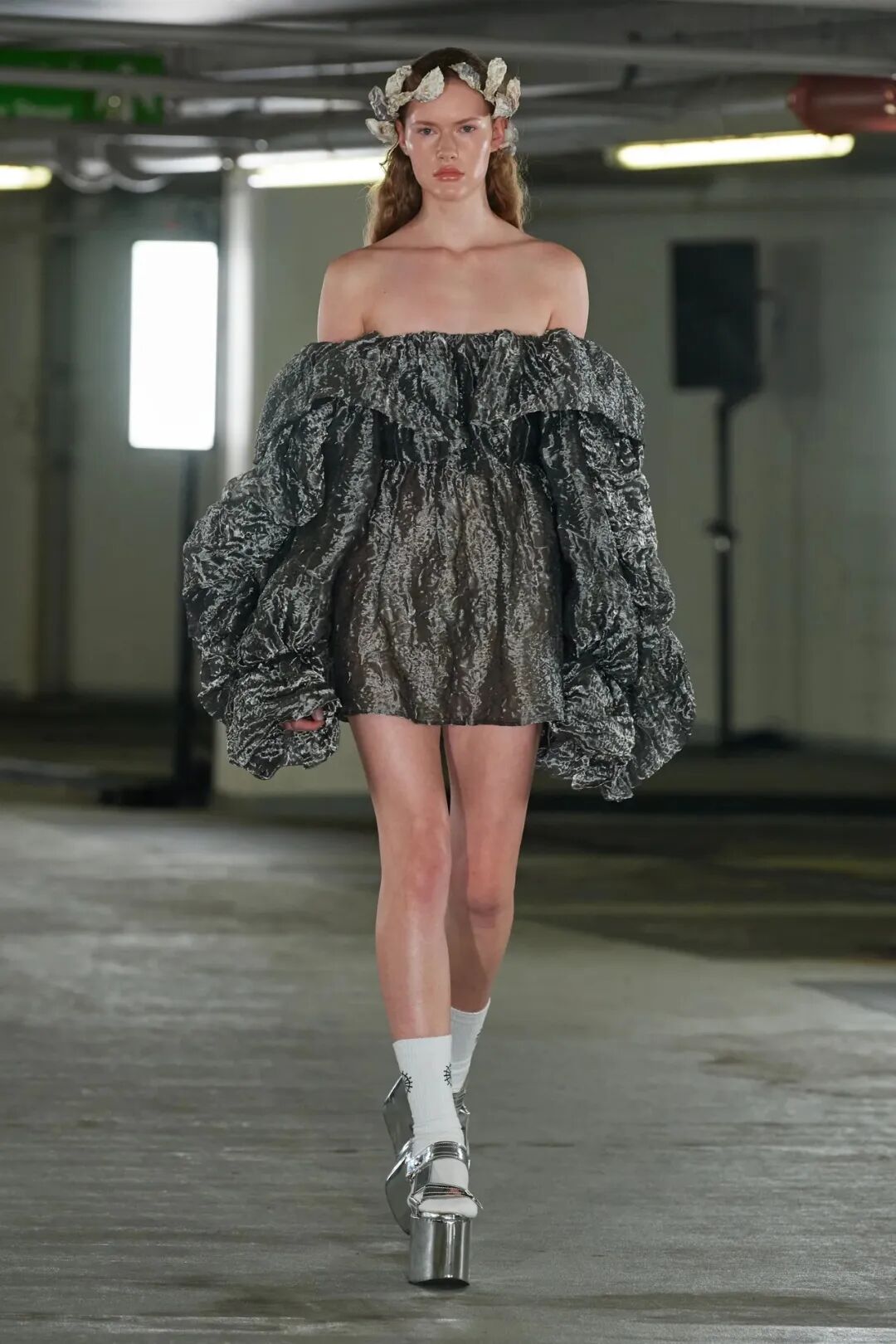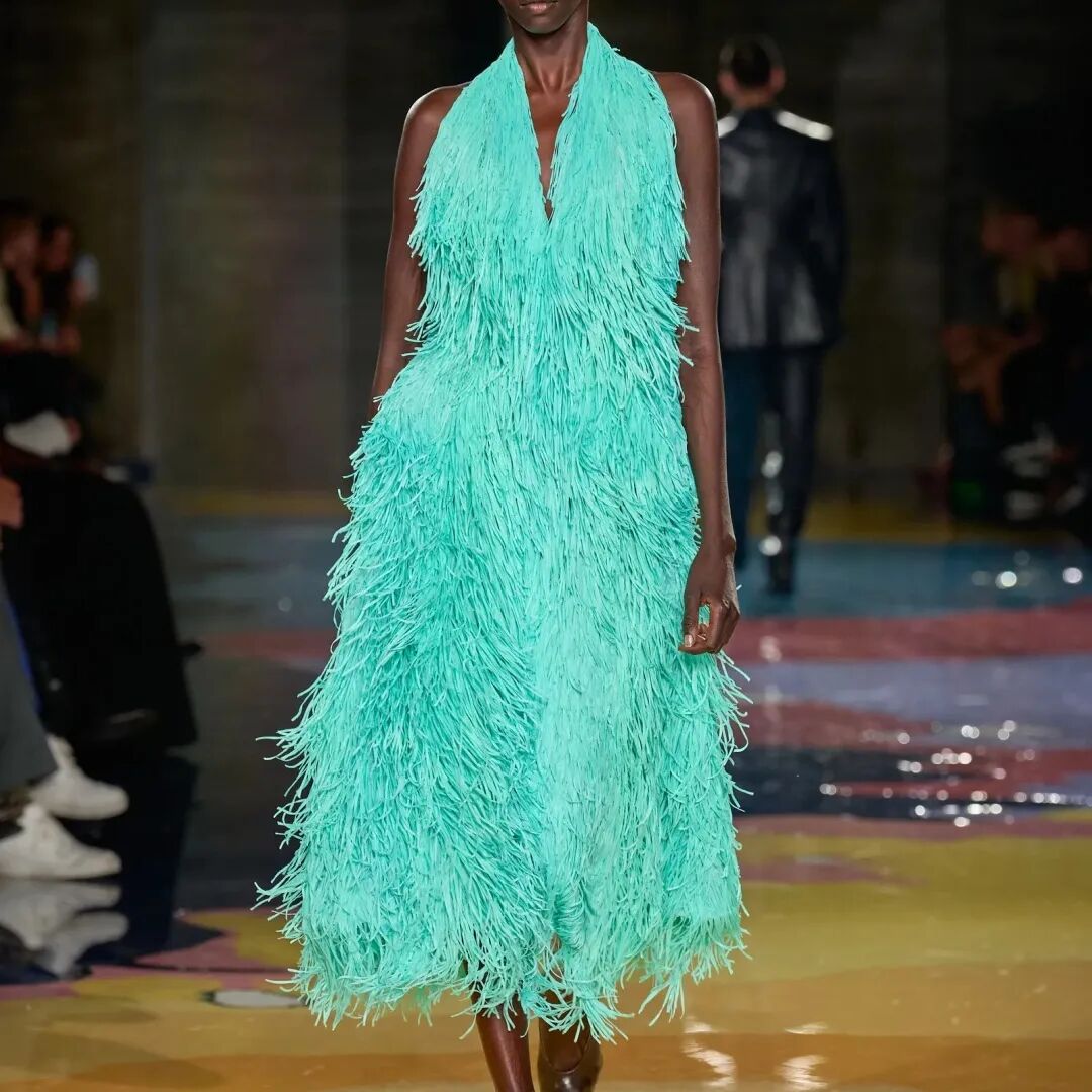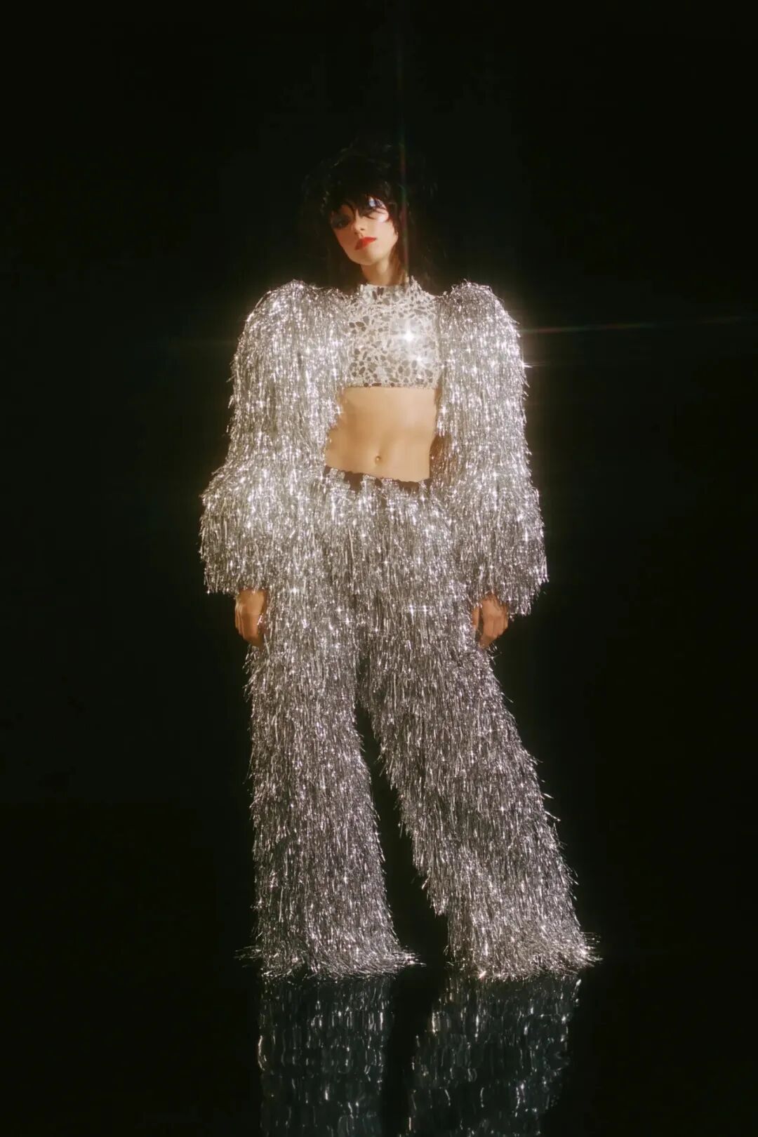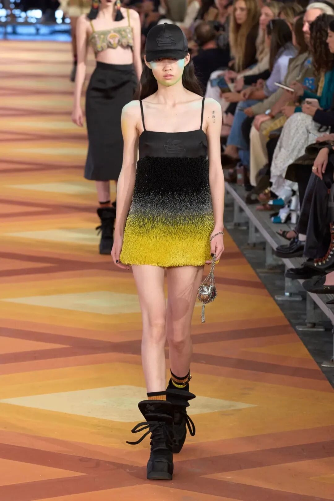 拉菲草、金属丝、羽毛和流苏增强了服装的触感。