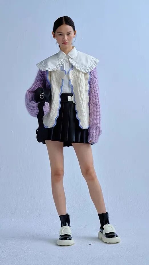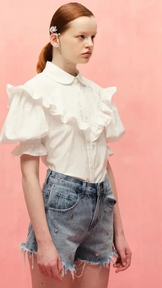 上衣品类在该风格主题下的呈现方式更为丰富。针织和梭织品类都不容忽视,将褶边、娃娃领、泡泡袖、荷叶边、绑带以及立体装饰等细节融入传统单品;可以尝试使用截短款式,尽显年轻活力。