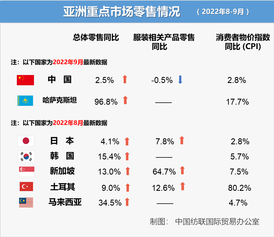 8至9月,亚洲多国通胀上行,服装消费实际需求依然较弱。