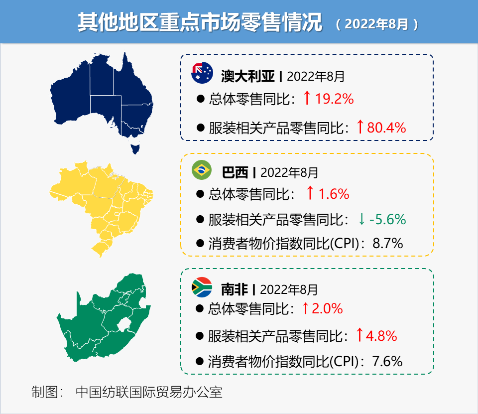 受燃料价格下跌影响,南非通胀率略有回落,8月降至7.6%。当月,南非零售额同比增长2.0%。南非纺织品、服装、鞋类和皮制用品零售额为135.6亿兰特(约7.6亿美元),同比增长4.8%。