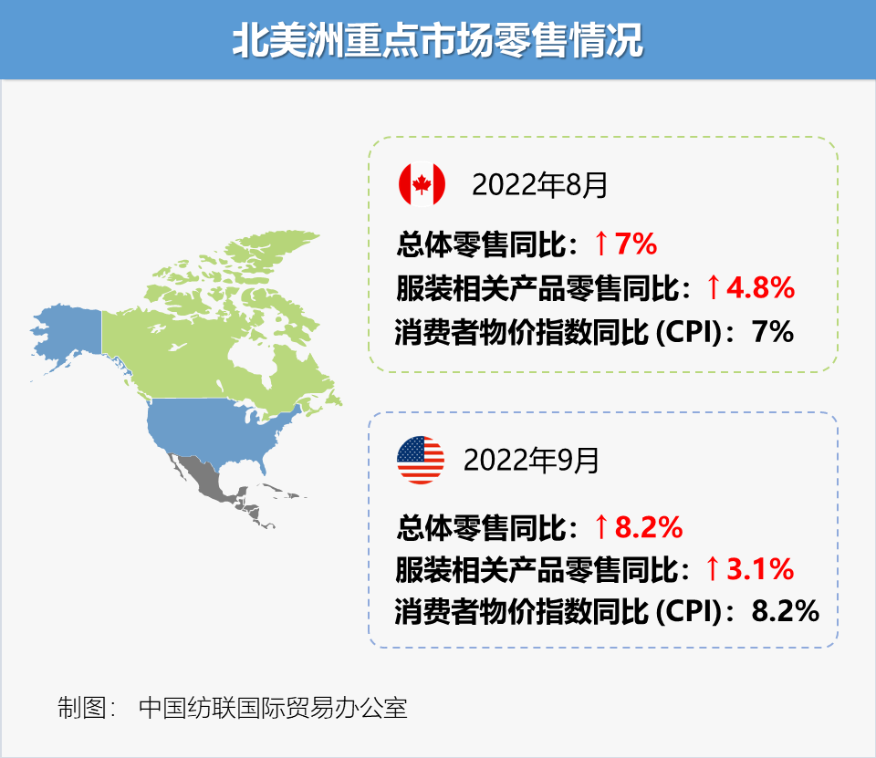 8月,受汽油价格回落影响,加拿大通胀率连续两个月下滑至7%。同月,加拿大零售总额同比增加7%,环比略增0.7%;服装类用品销售额为24.5亿加元(约18.1亿美元),环比下降0.2%,同比增长4.8%,涨幅进一步缩窄。