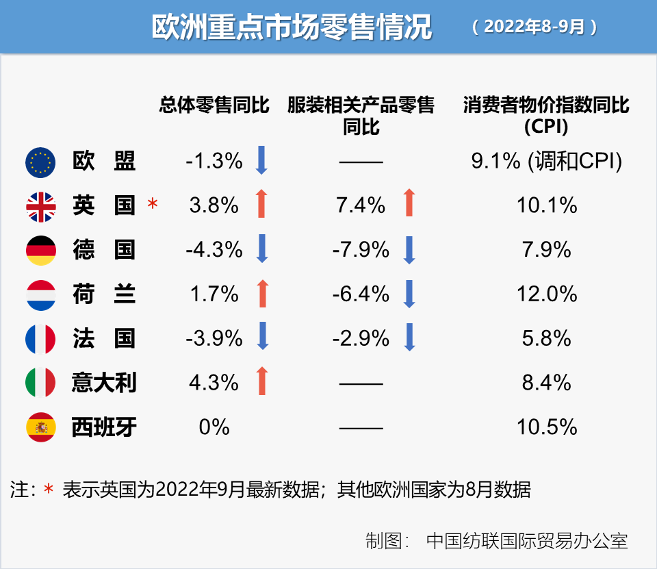 随着9月英国通胀率攀升至10.1%,英国消费者的信心接近历史低点,当月英国零售额环比下降1.4%,降幅超出市场预期。英国9月纺织品、服装和鞋类产品销售额达49.5亿英镑(约57.5亿美元),同比增长7.4%。
