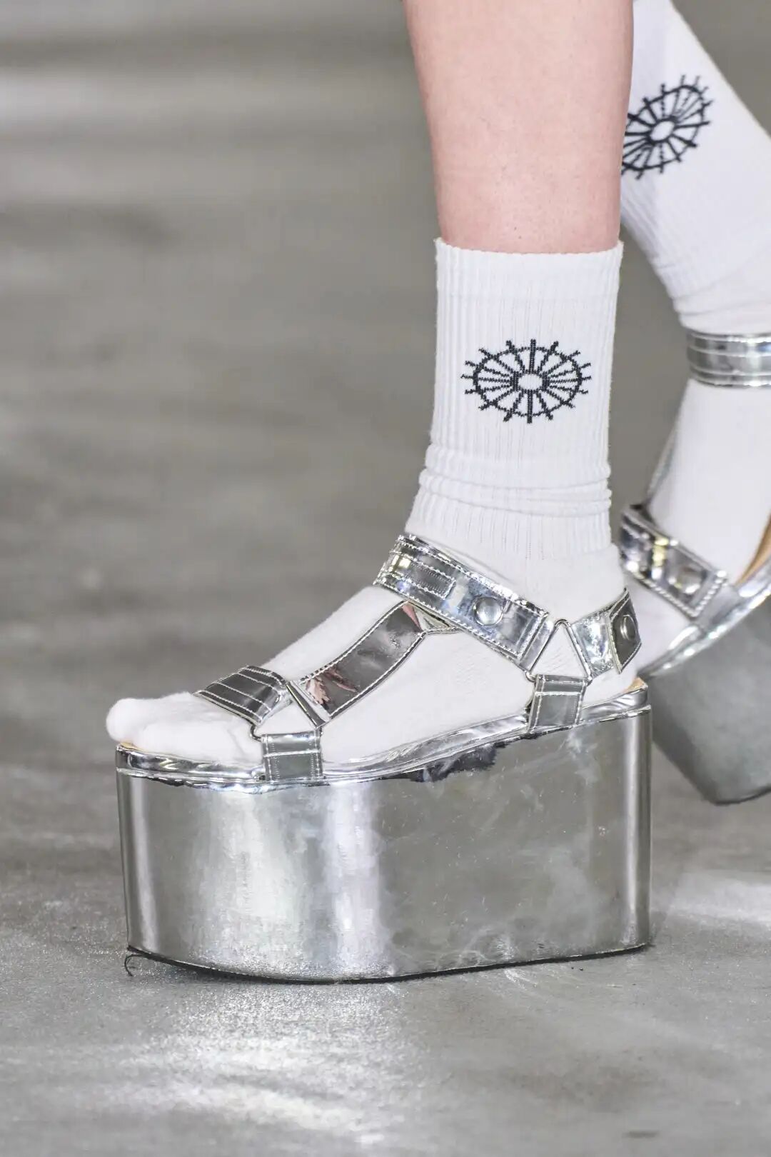 从凉鞋到玛丽珍鞋,90年代风格厚底在多种鞋型上出现,为醒目配饰奠定基调。金属表面和材料混搭更新关键单品。图:Edward Crutchley
