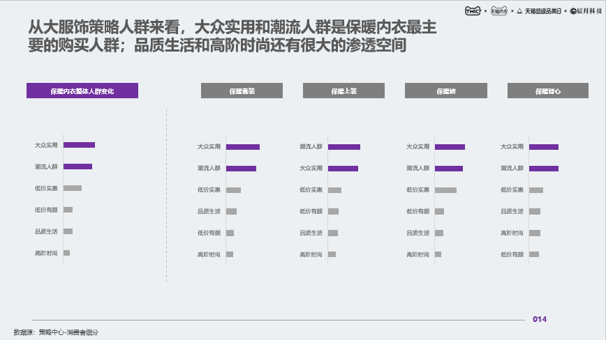 保暖内衣品类中大服饰策略四大重点人群为:潮流人群、品质生活、大众实用和高阶时尚;其中大众实用和潮流人群是保暖内衣最主要的购买人群,而品质生活和高阶时尚还有很大的渗透空间。
