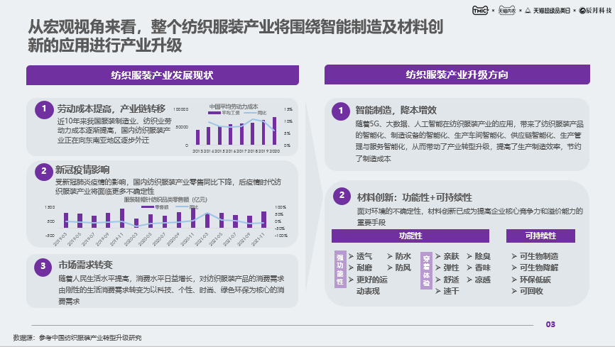 从宏观角度看,整个纺织服装产业将围绕智能制造及材料创新的应用进行产业升级。聚焦到保暖内衣品类,将随着内衣行业的发展而逐步壮大,并表现出三个愈发明显的趋势:穿着场景演变、品类消费升级、竞争格局重塑。