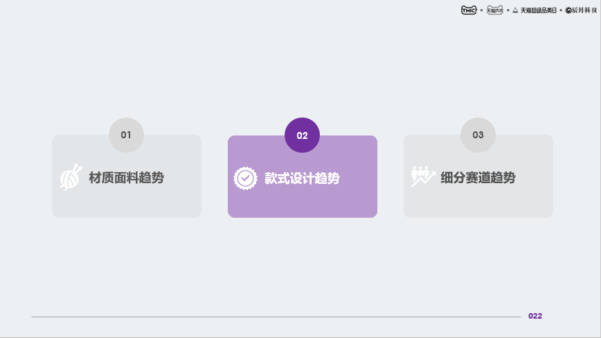款式设计趋势中,款式细节主要在荷叶边、开衫款、一片式中更具趋势。领型趋势具体表现在立领、一字领、高圆领和堆堆领。图案趋势以心形和豹纹为主。颜色趋势以深卡其布色和褐色为主。克重趋势具体表现在180克及以下、180克-250克。