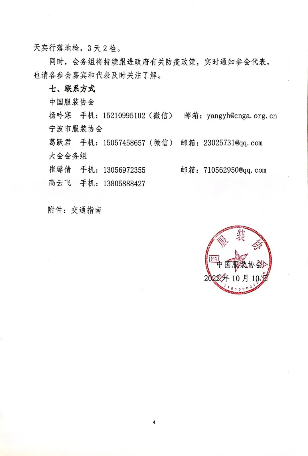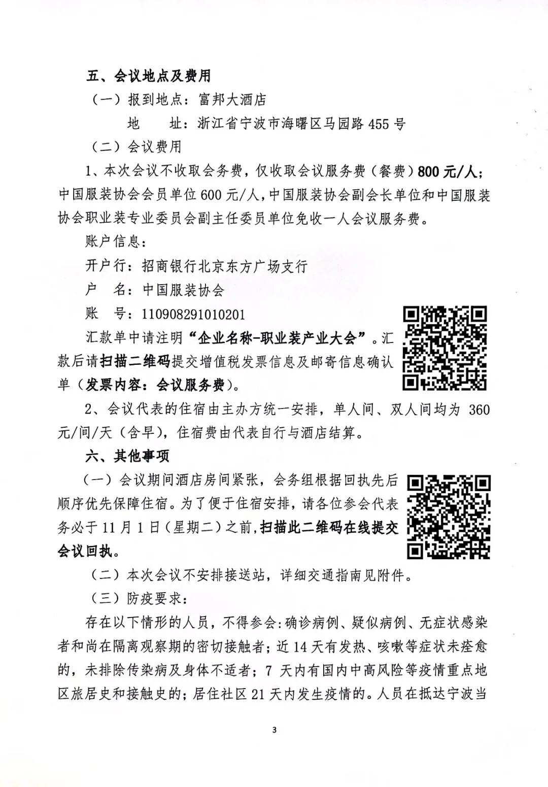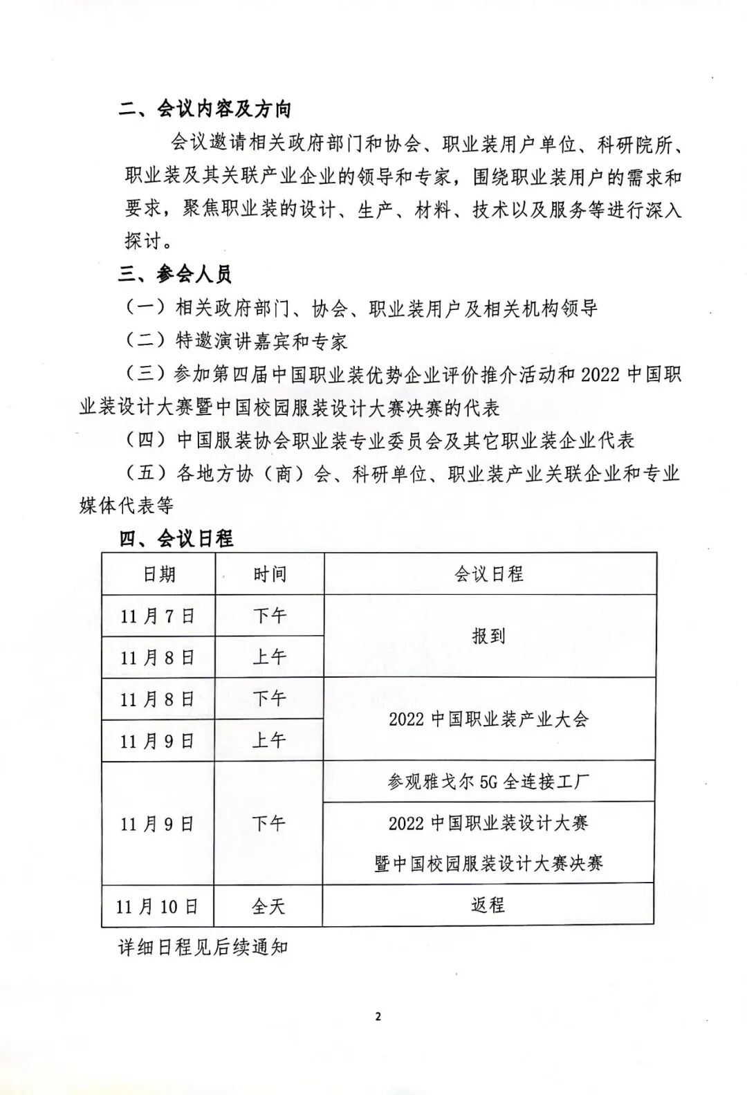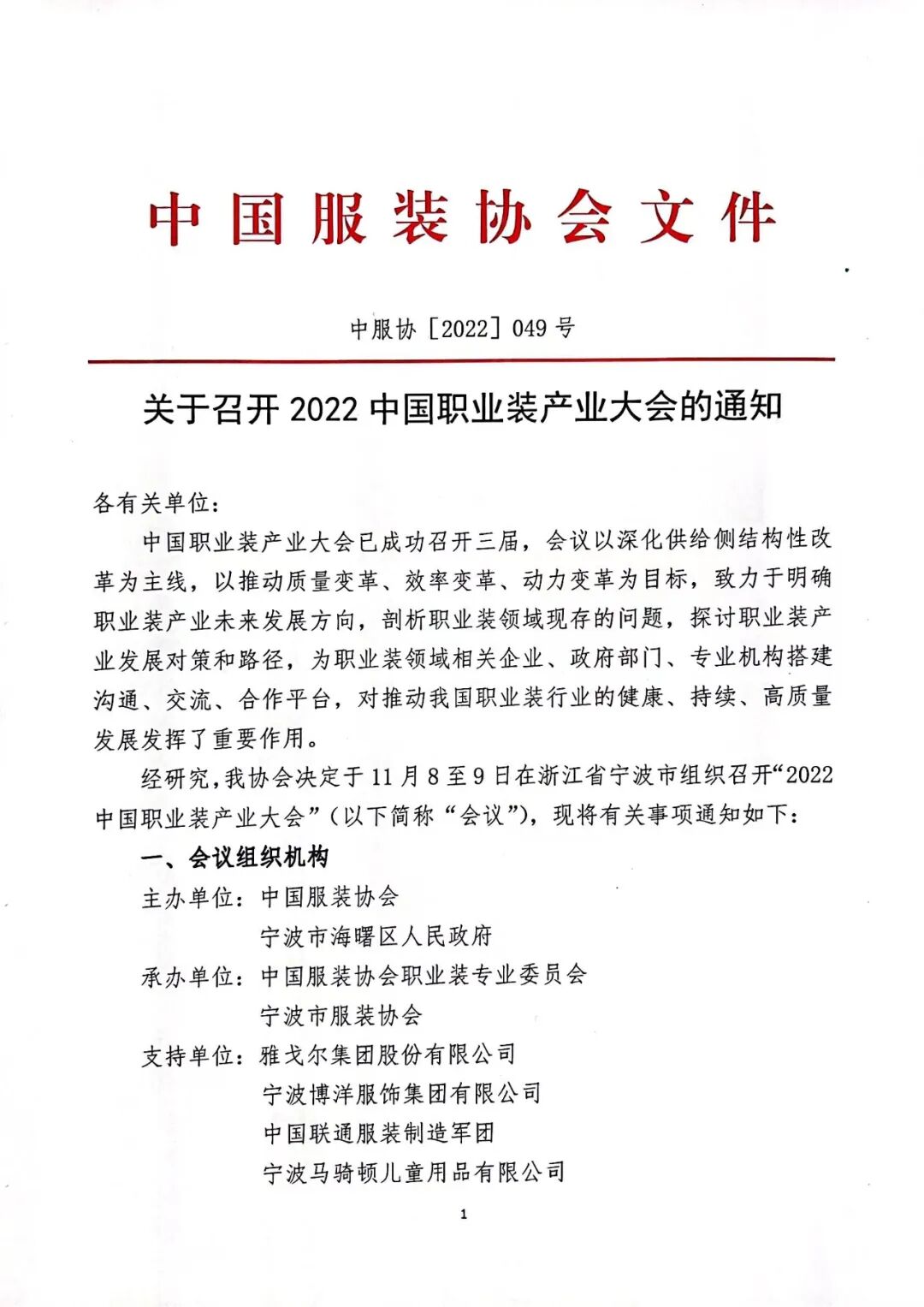 经研究,我协会决定于11月8至9日在浙江省宁波市组织召开“2022中国职业装产业大会”(以下简称“会议”),现将有关事项通知如下: