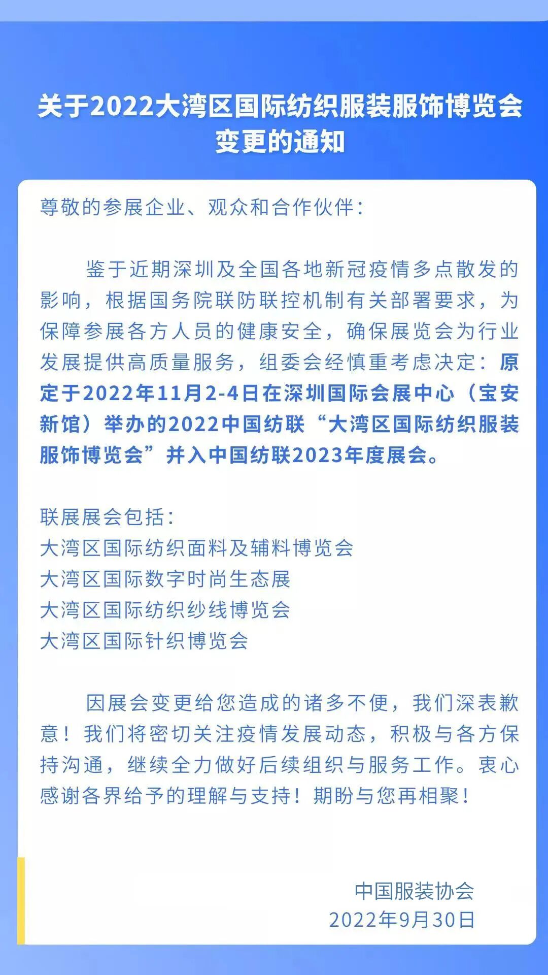 关于2022大湾区国际纺织服装服饰博览会变更的通知