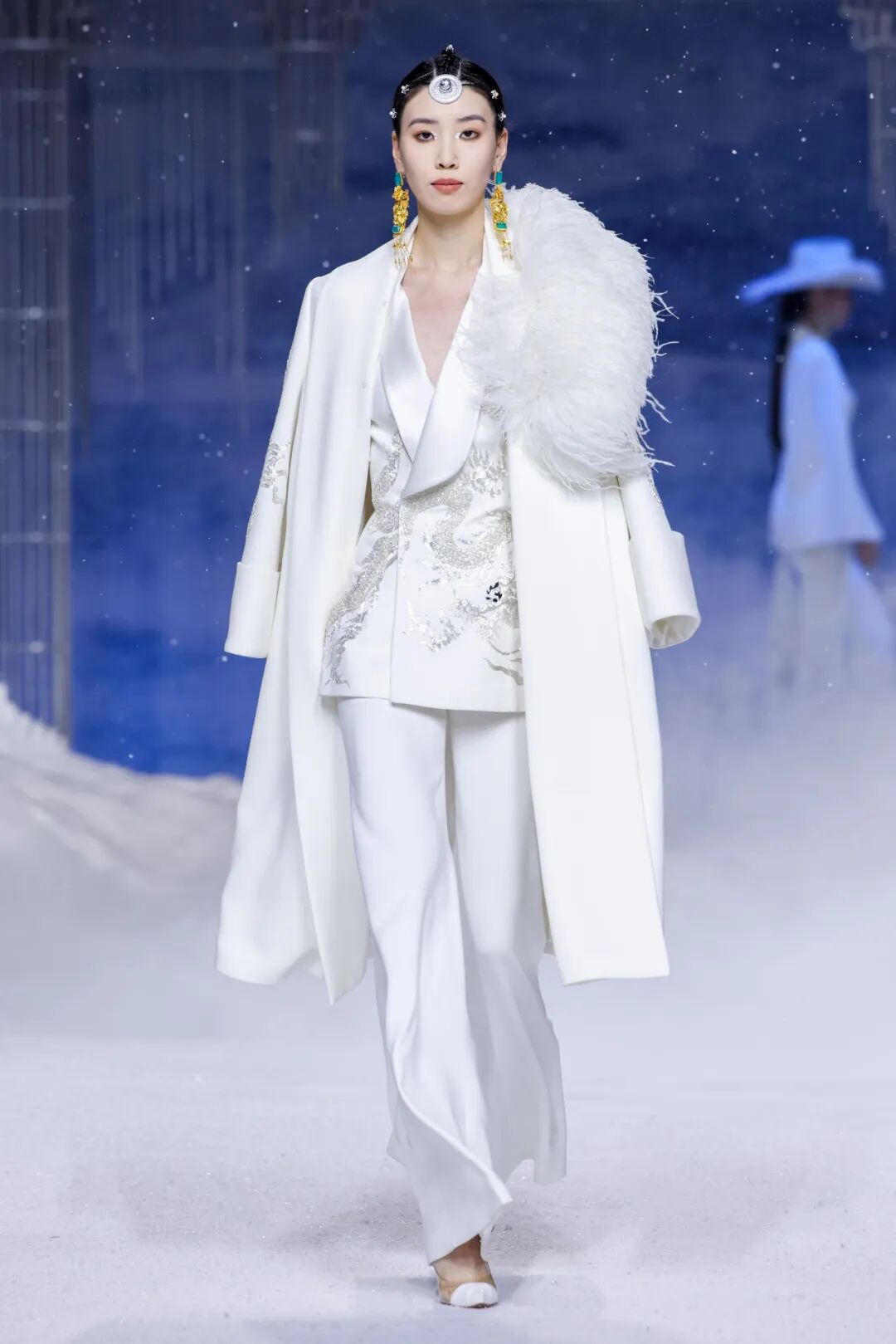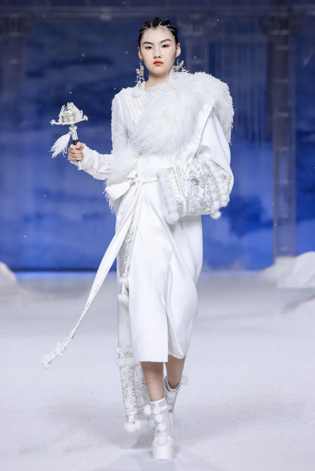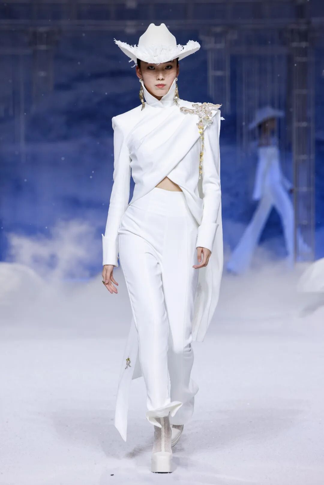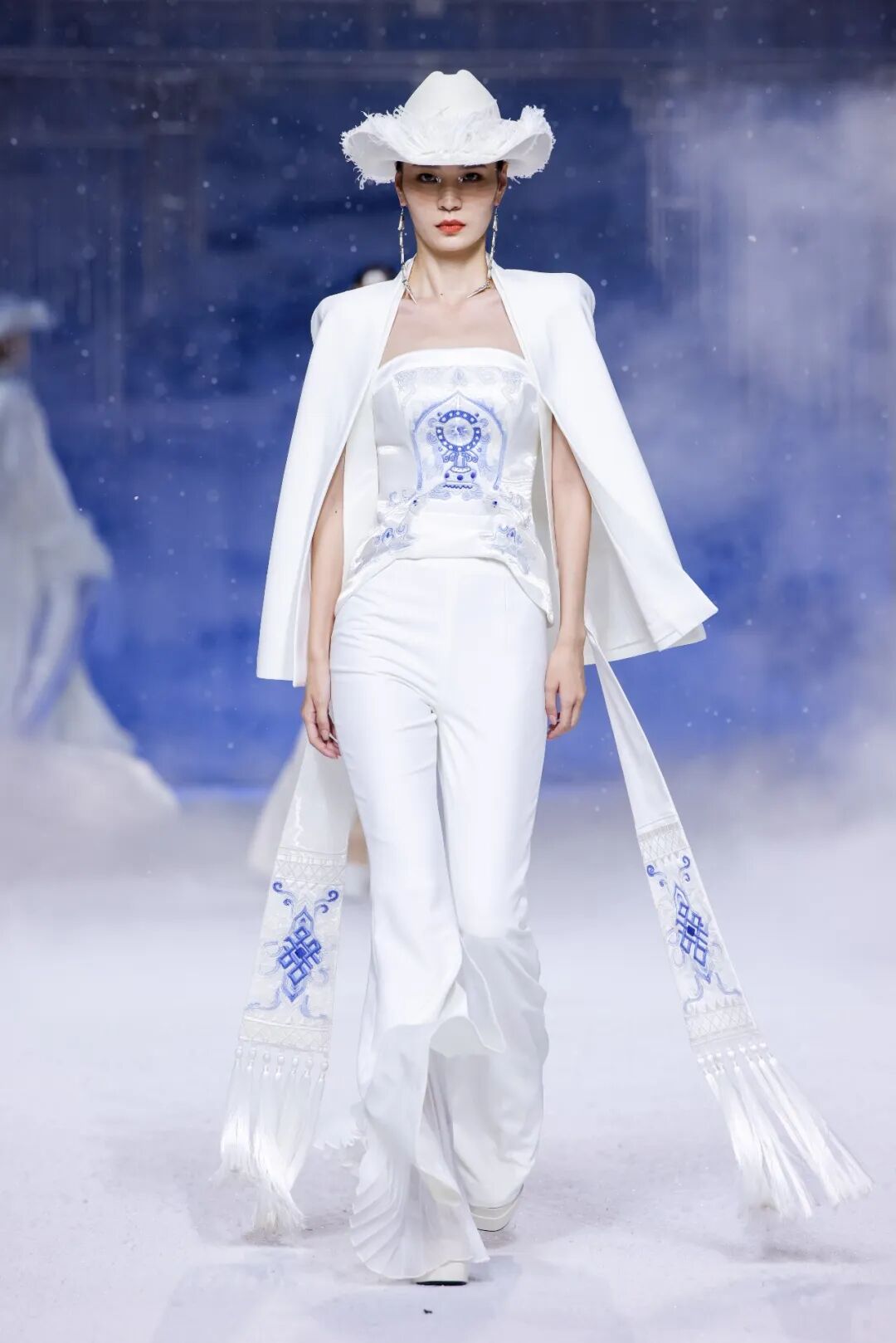 《扎西达杰》灵感源于藏传佛教中的祥瑞图腾,结合宝伞和吉祥结的纹样。以纯白为基调,制式强调图案与面料之间的立体空间浮雕感。领袖以绒球、羽毛装饰,厚重和轻盈兼顾。