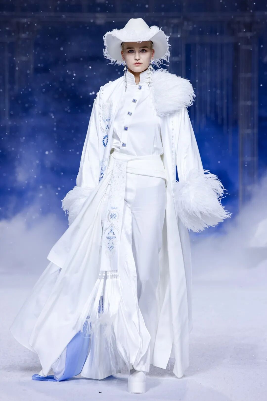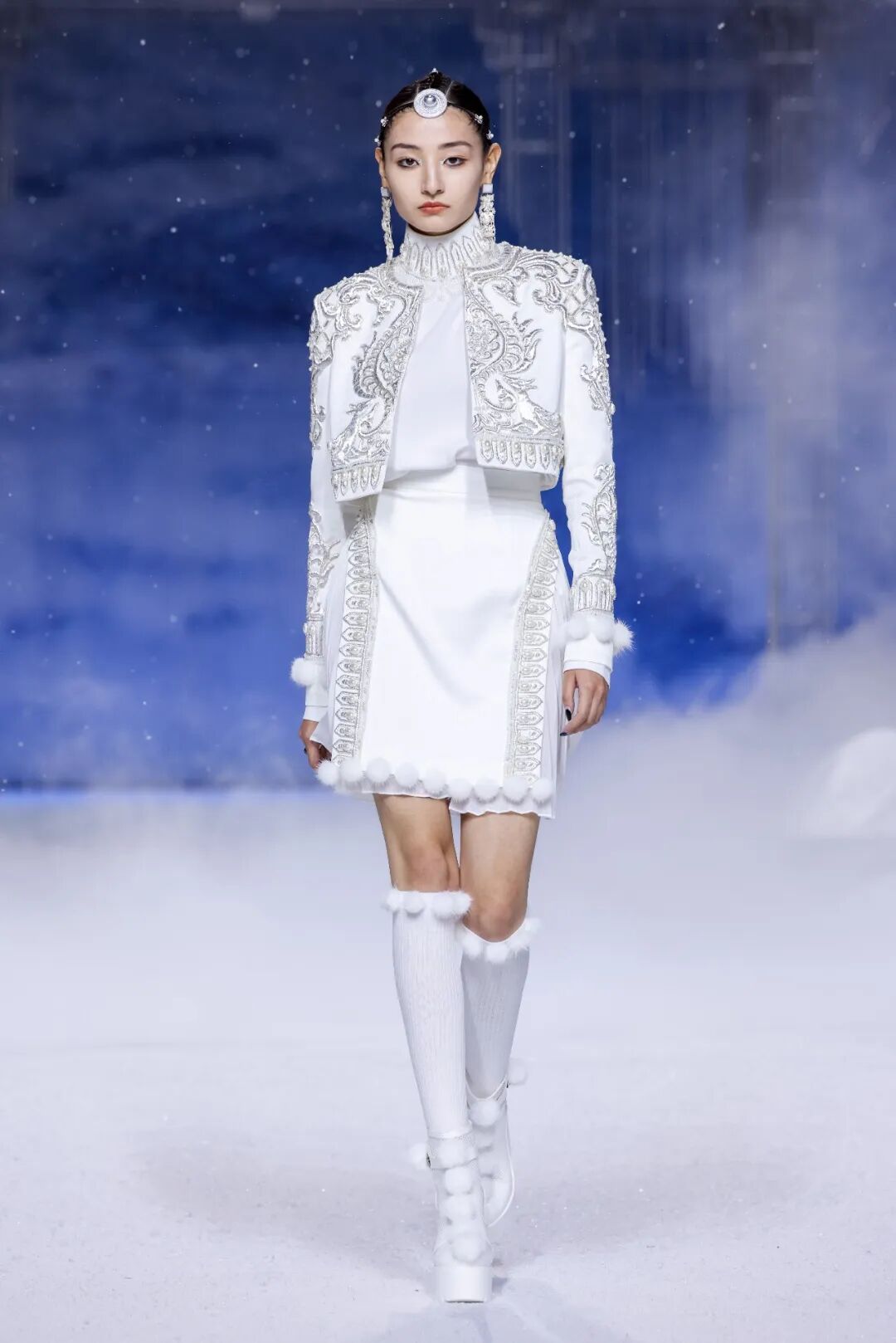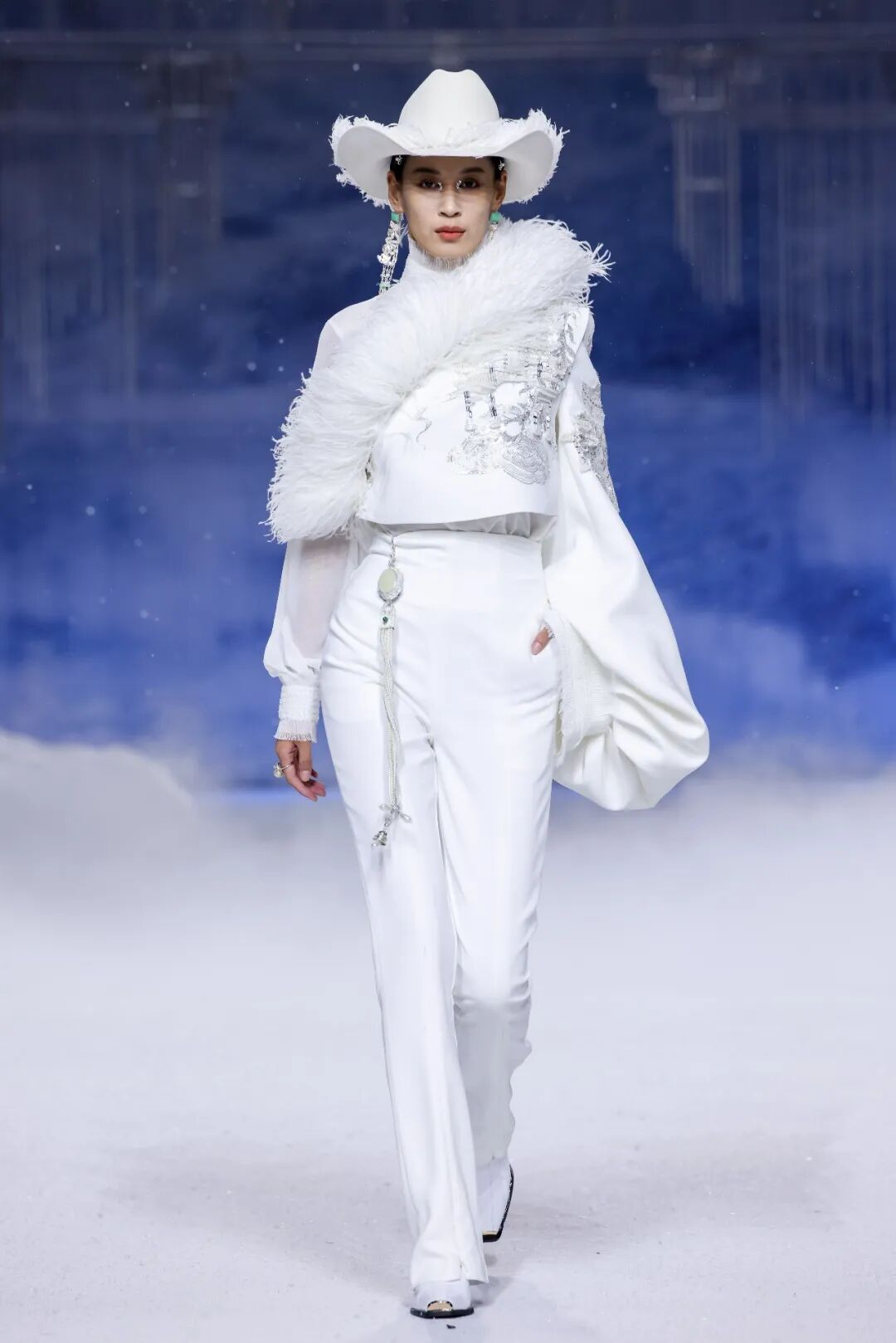 《扎西达杰》灵感源于藏传佛教中的祥瑞图腾,结合宝伞和吉祥结的纹样。以纯白为基调,制式强调图案与面料之间的立体空间浮雕感。领袖以绒球、羽毛装饰,厚重和轻盈兼顾。