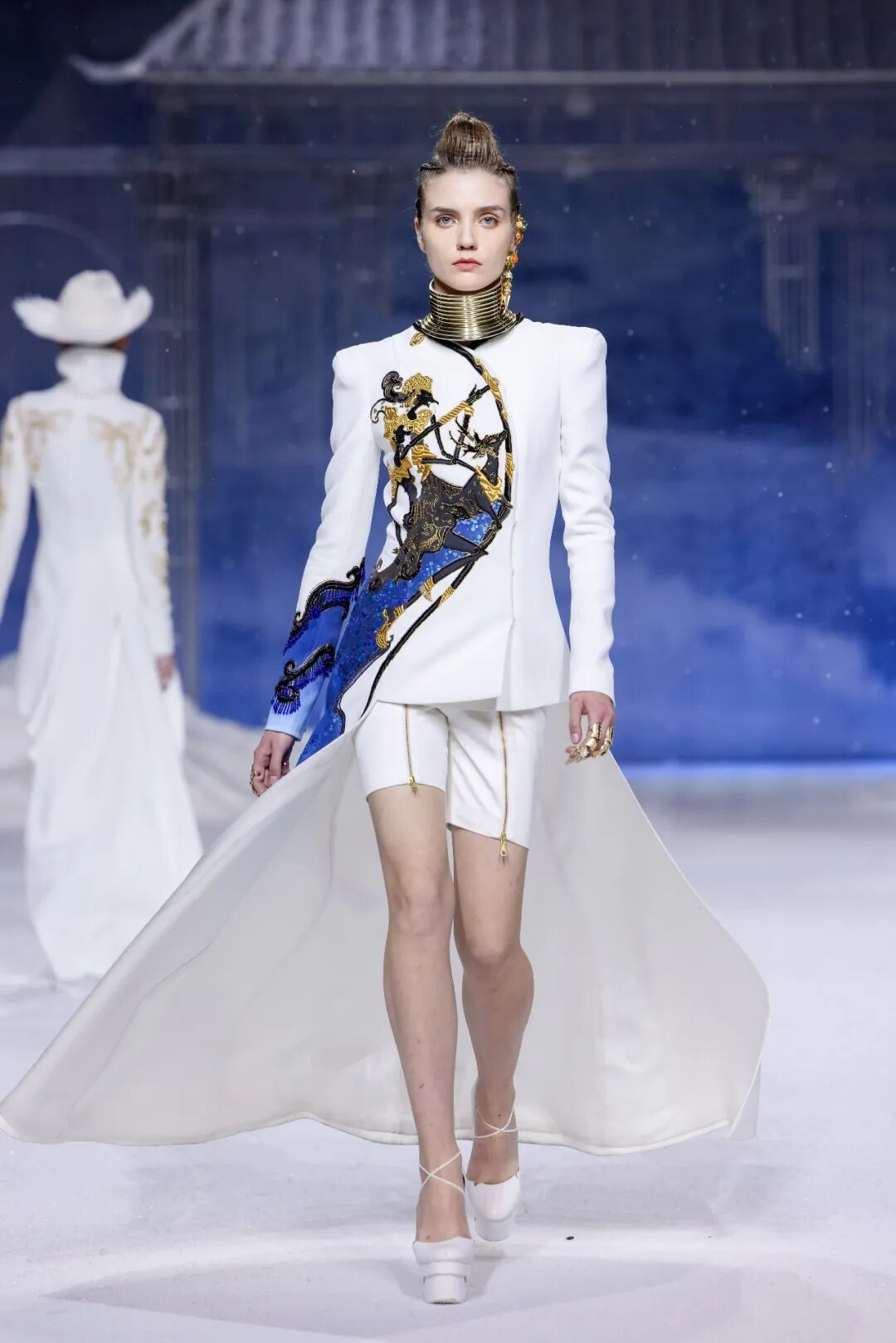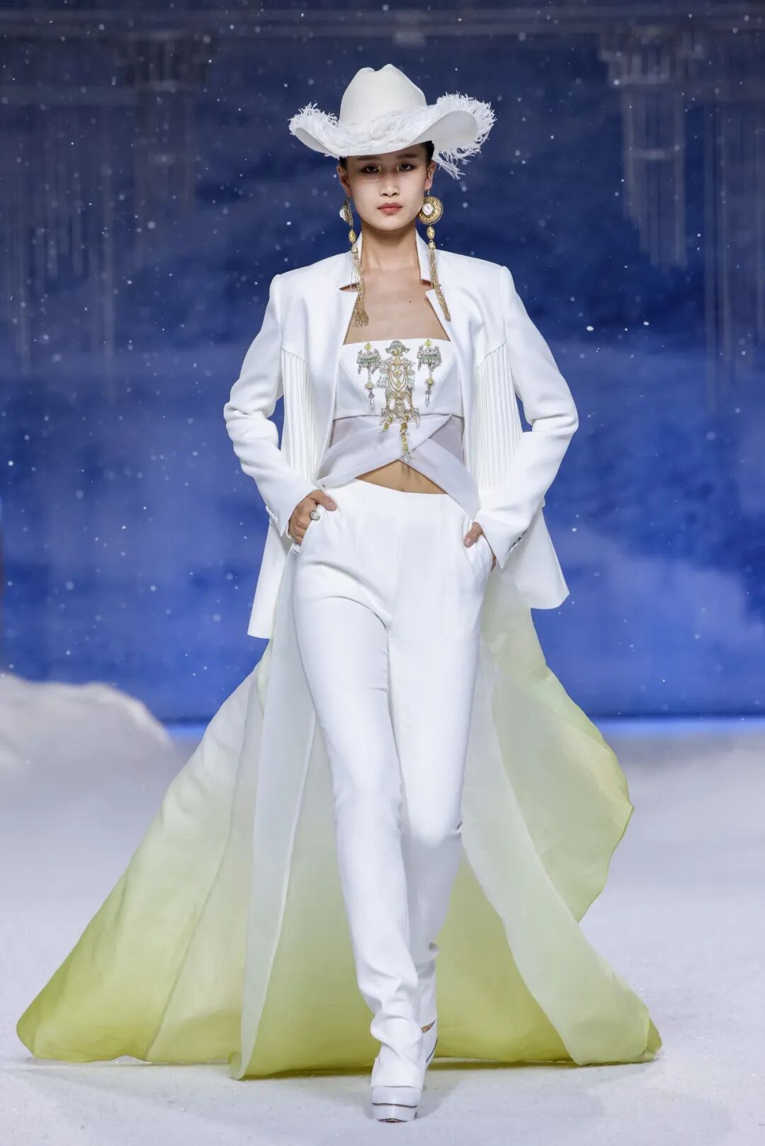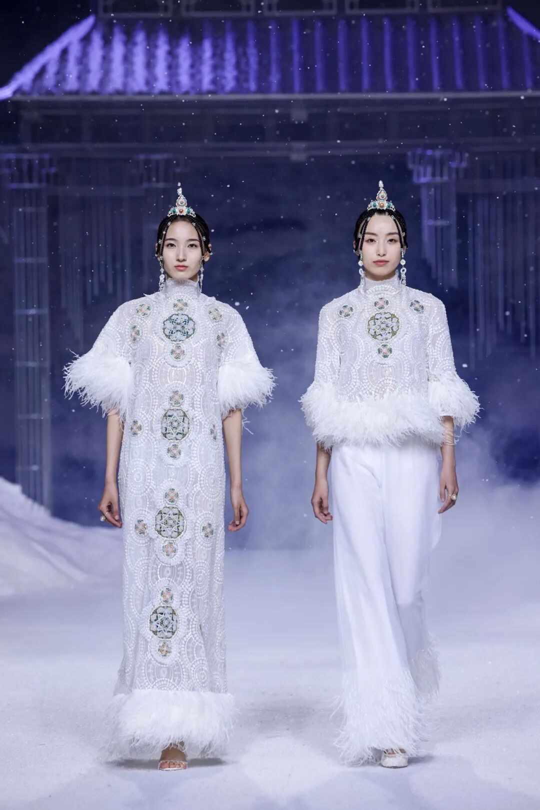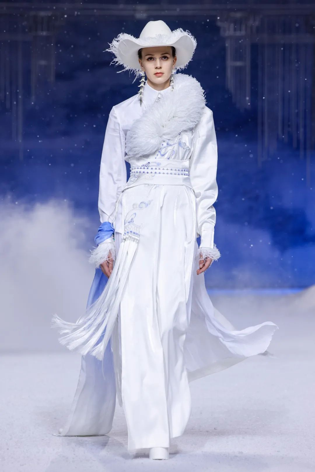 《扎西达杰》灵感源于藏传佛教中的祥瑞图腾,结合宝伞和吉祥结的纹样。以纯白为基调,制式强调图案与面料之间的立体空间浮雕感。领袖以绒球、羽毛装饰,厚重和轻盈兼顾。