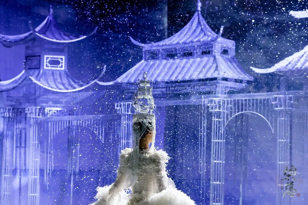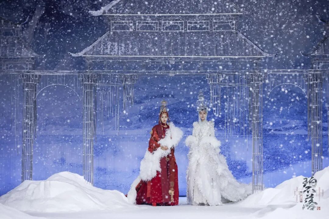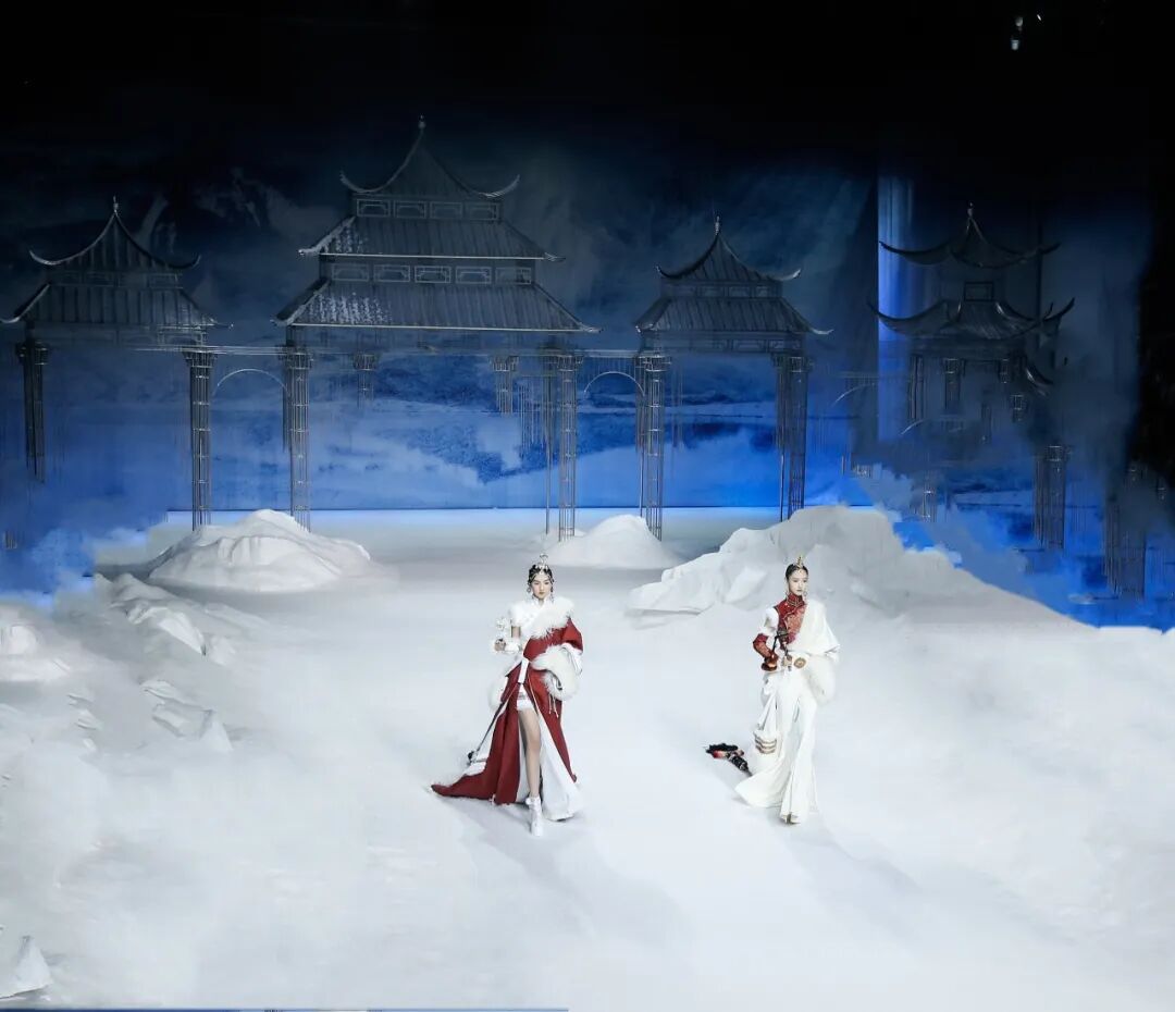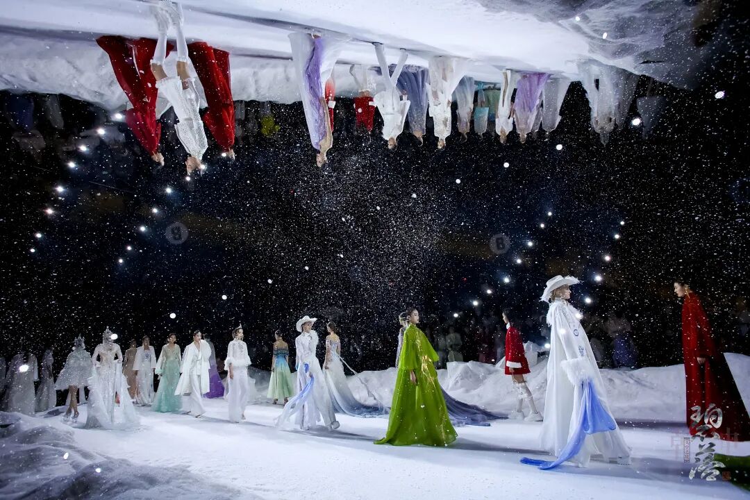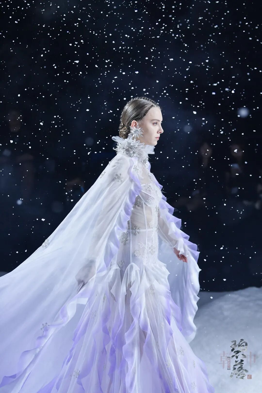 本次秀场,在一曲空灵且梵呗的妙音中,和营造的高山雪景中拉开序幕,秀场中纷飞的雪景,萦绕整个舞台,让观众沉浸在满天飞雪的意境中,仿若置身神圣、纯净的雪山圣域。高远、悠长的音乐涤荡心灵,打造出一场极具自然震撼力且惊艳众人的视听盛宴。
