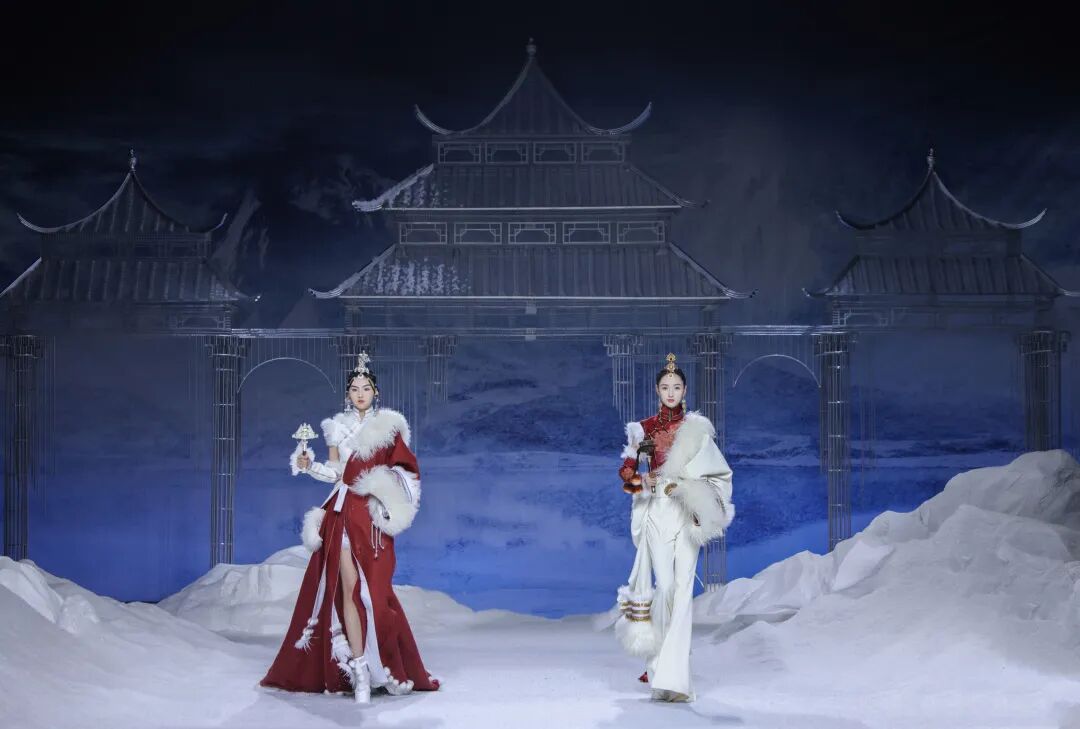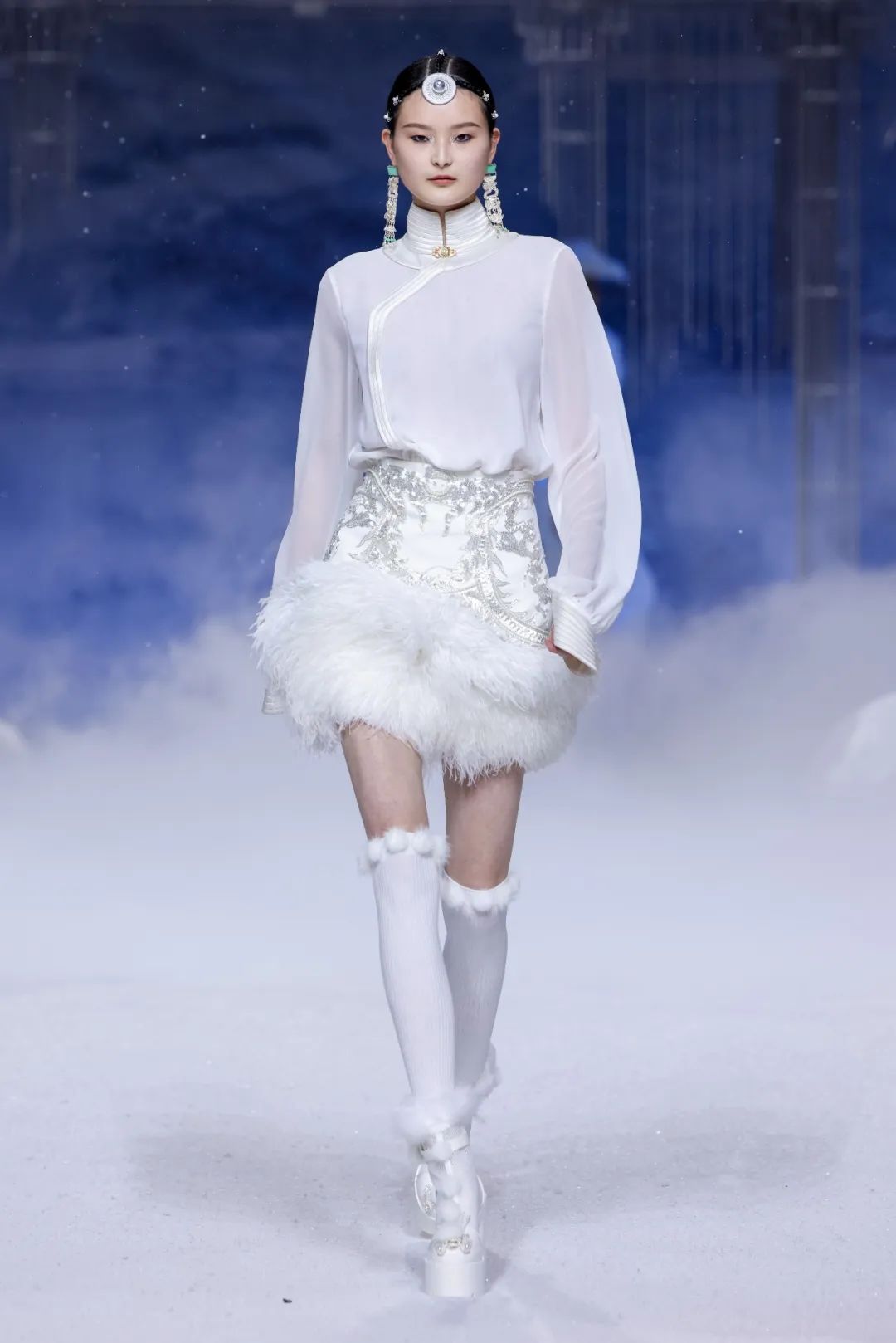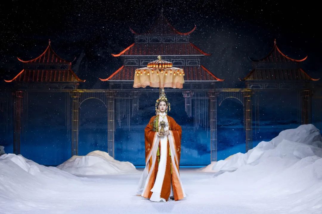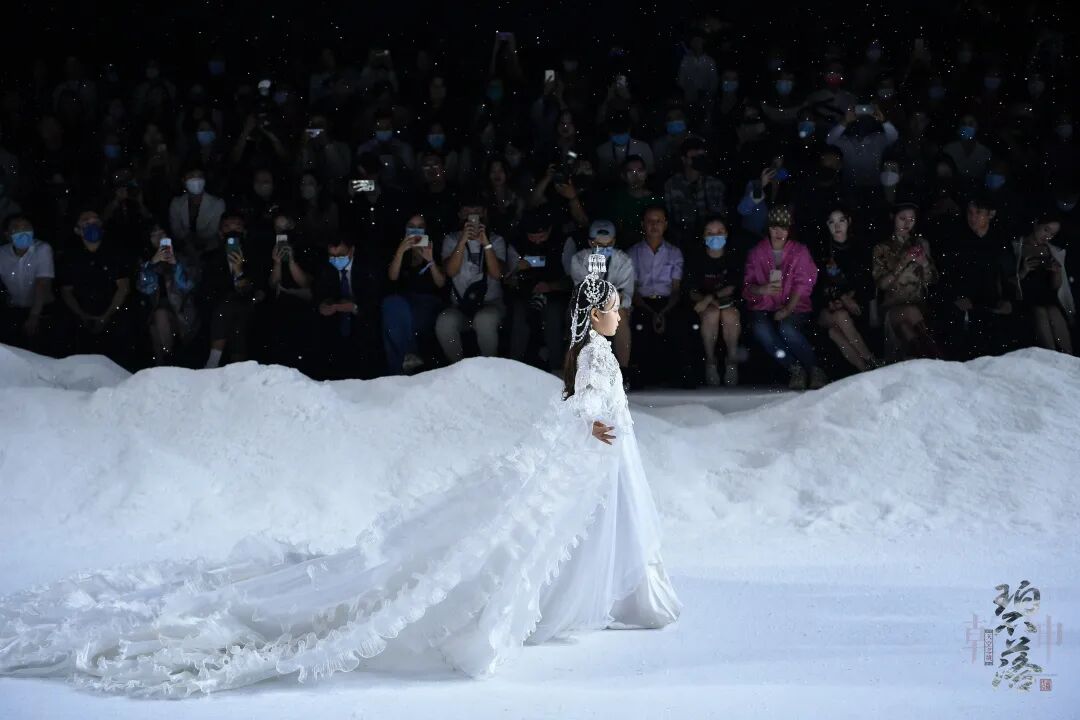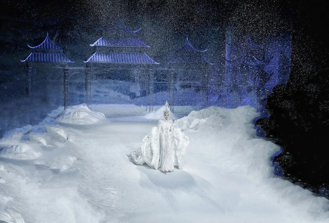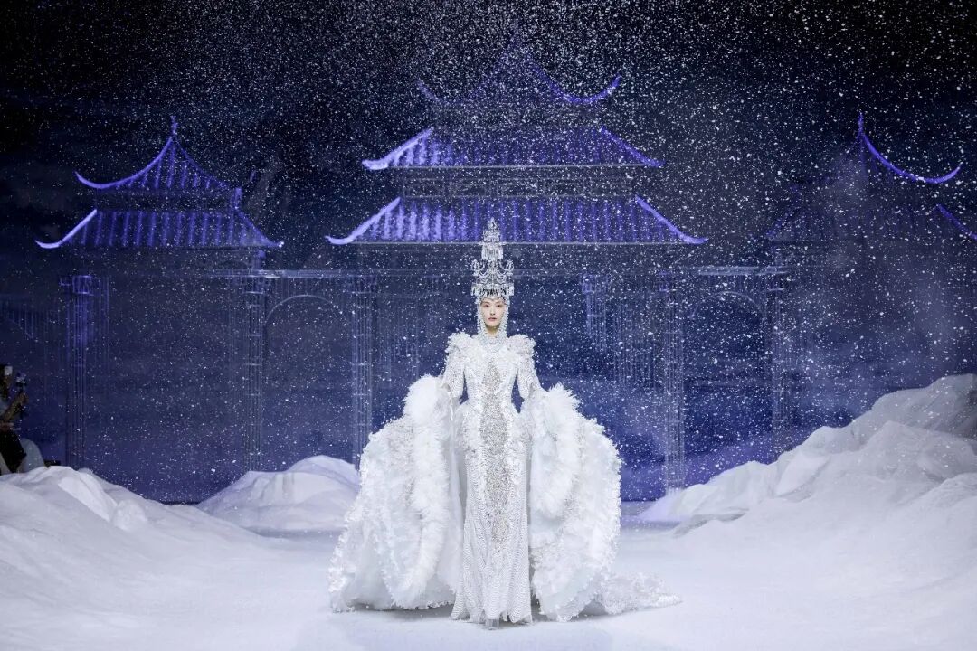 本次秀场,在一曲空灵且梵呗的妙音中,和营造的高山雪景中拉开序幕,秀场中纷飞的雪景,萦绕整个舞台,让观众沉浸在满天飞雪的意境中,仿若置身神圣、纯净的雪山圣域。高远、悠长的音乐涤荡心灵,打造出一场极具自然震撼力且惊艳众人的视听盛宴。