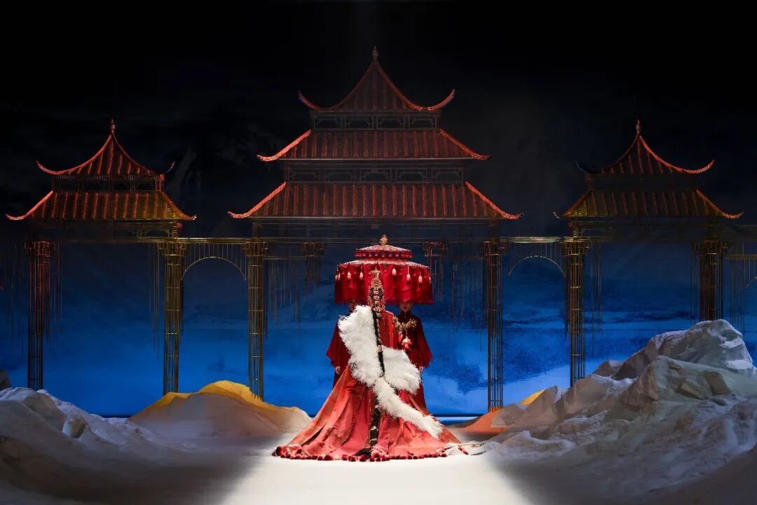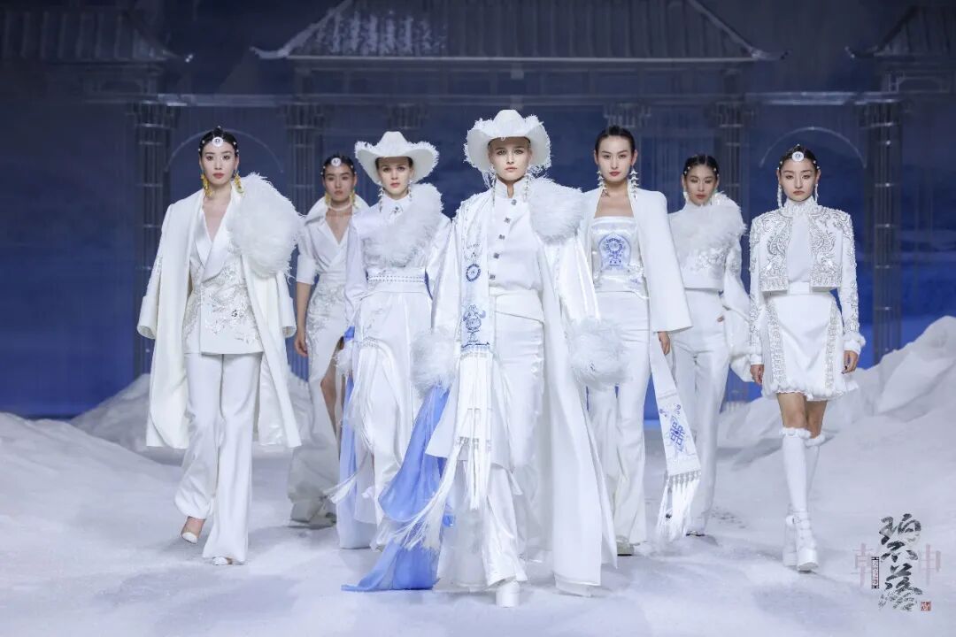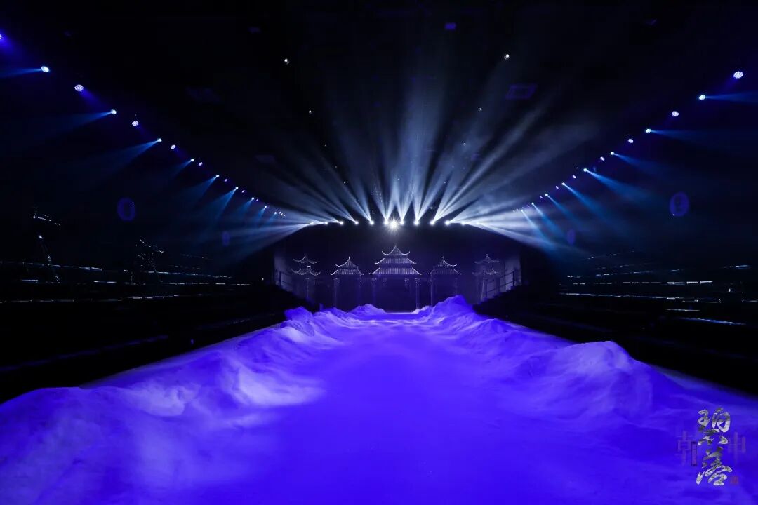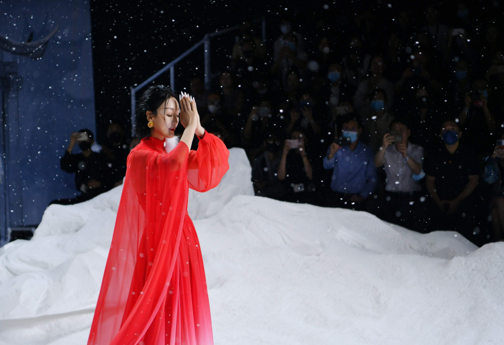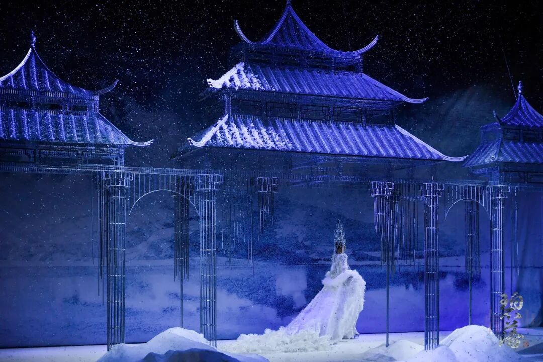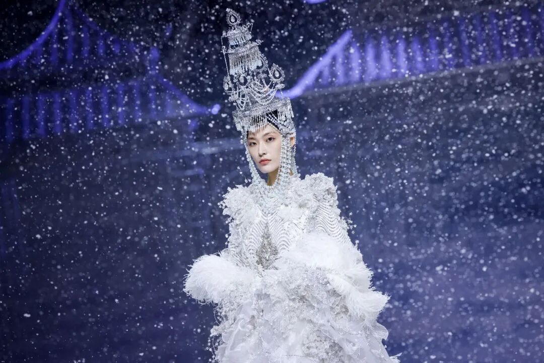 本次秀场,在一曲空灵且梵呗的妙音中,和营造的高山雪景中拉开序幕,秀场中纷飞的雪景,萦绕整个舞台,让观众沉浸在满天飞雪的意境中,仿若置身神圣、纯净的雪山圣域。高远、悠长的音乐涤荡心灵,打造出一场极具自然震撼力且惊艳众人的视听盛宴。