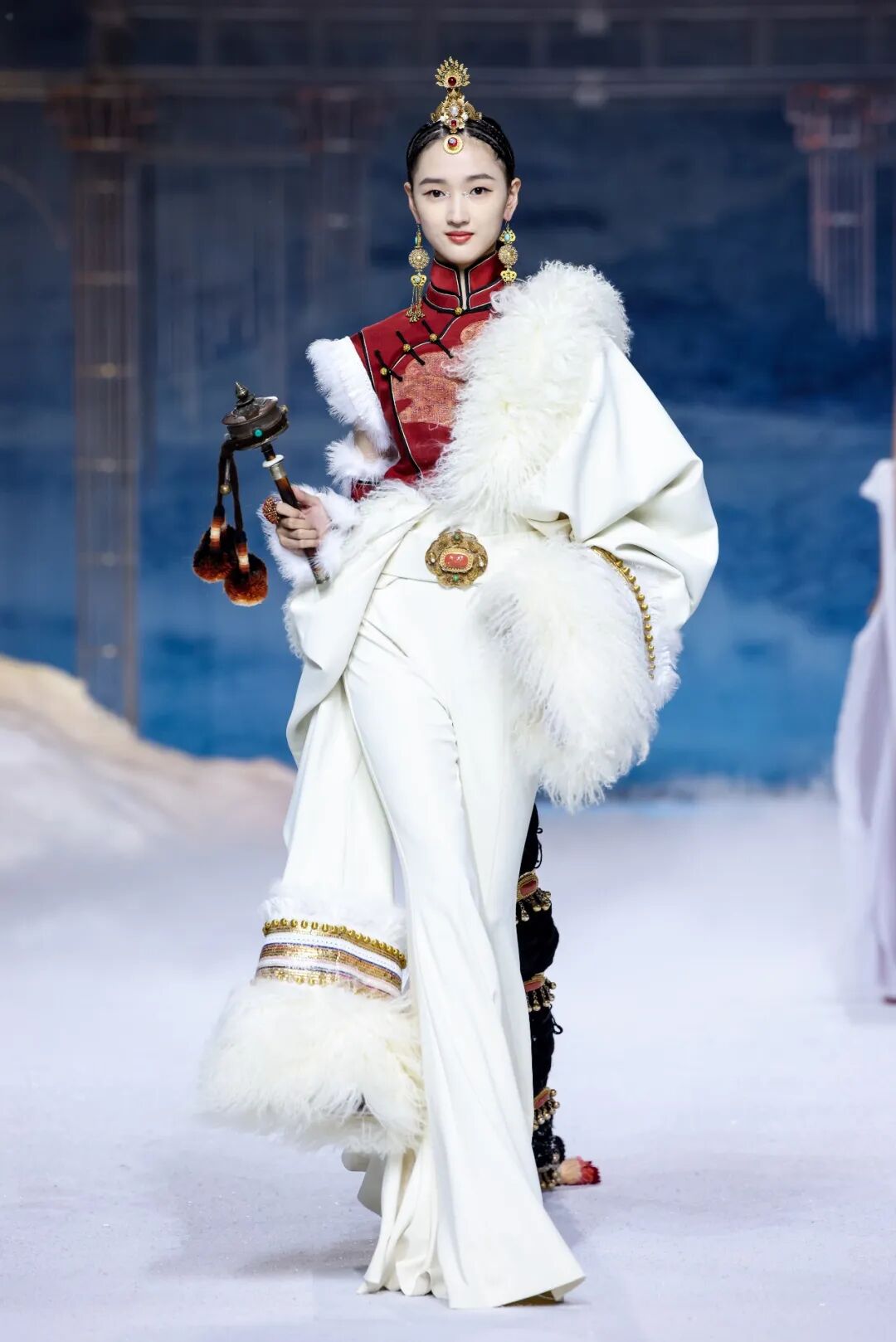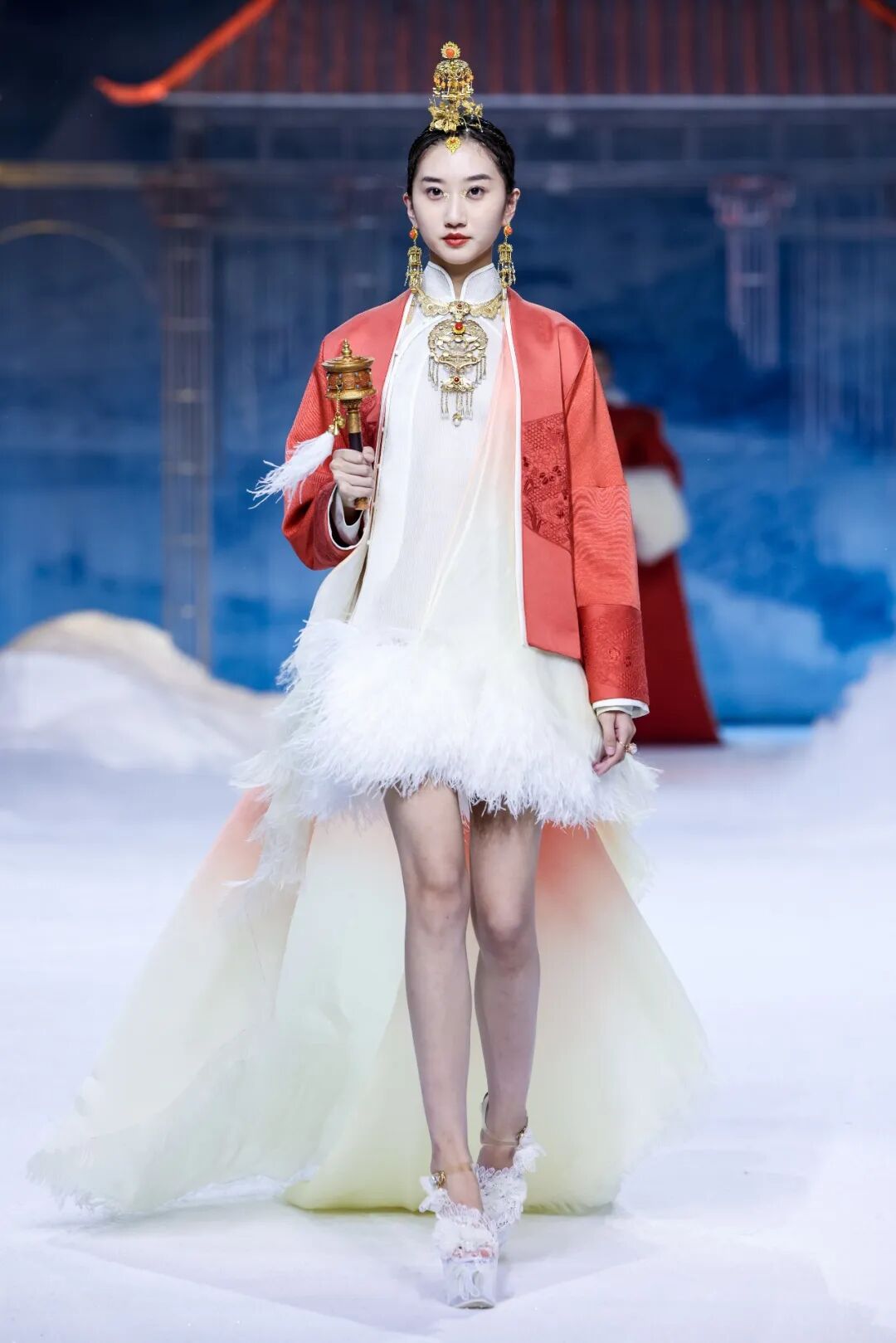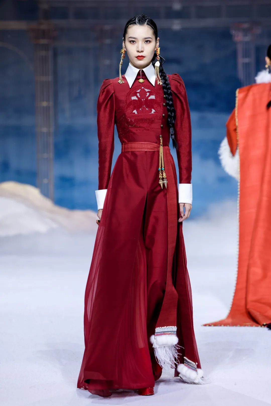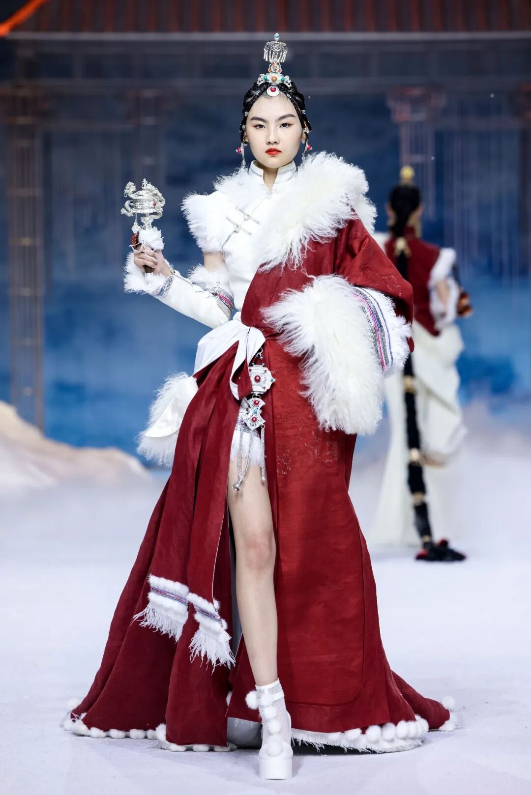 《雪域红殿》灵感源于布达拉宫,红白宫相映、鎏金宝顶,气势恢宏。汲取藏服制式的长袖,对襟,不对称斜裁,配以灵花、宝瓶、菱格等图样,金线钩绣,光彩夺目、神圣吉祥。