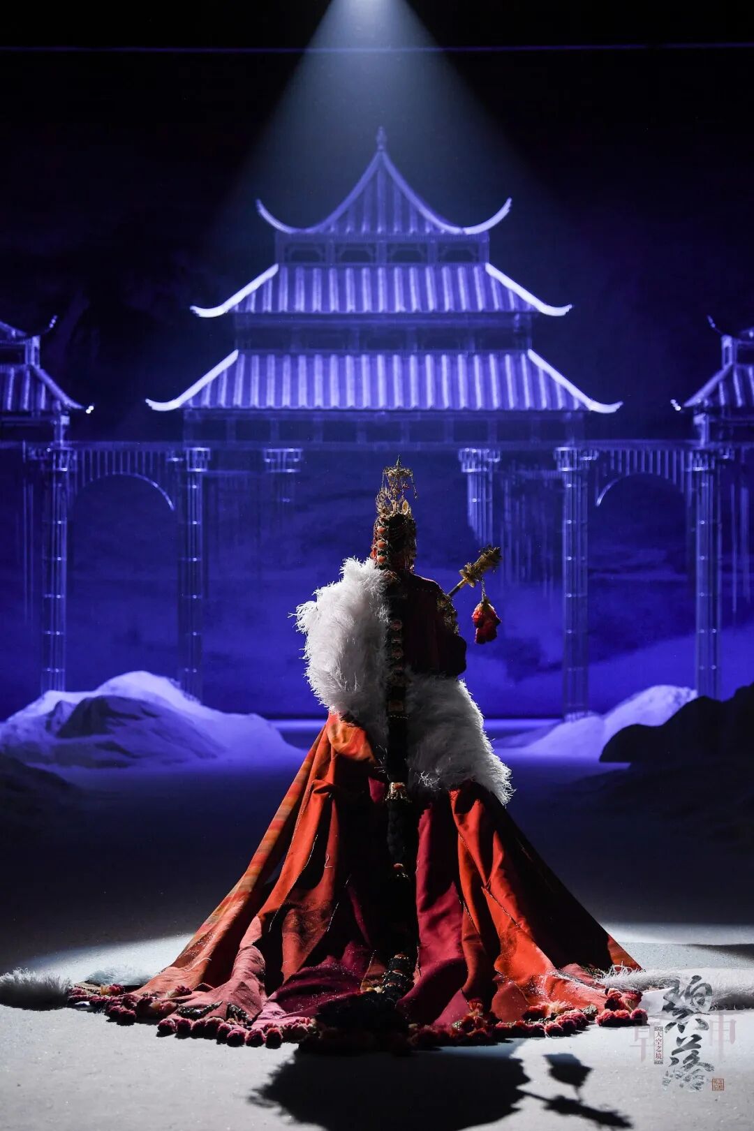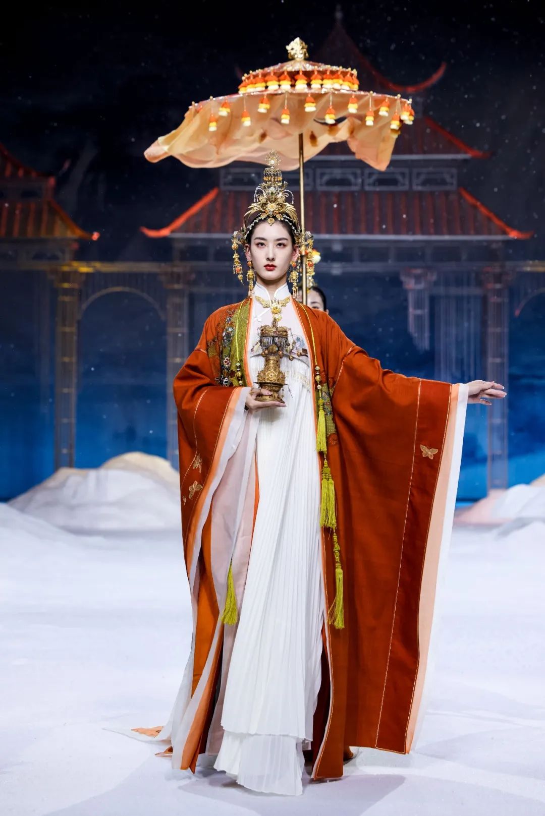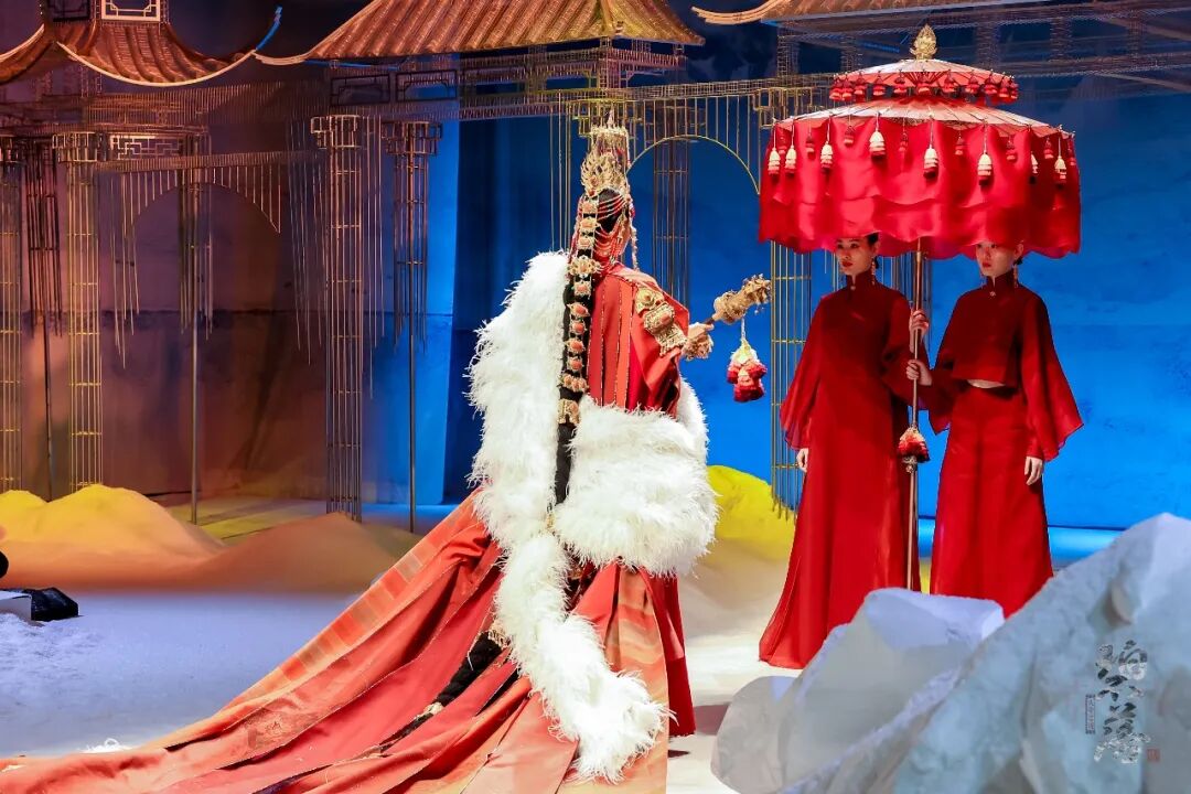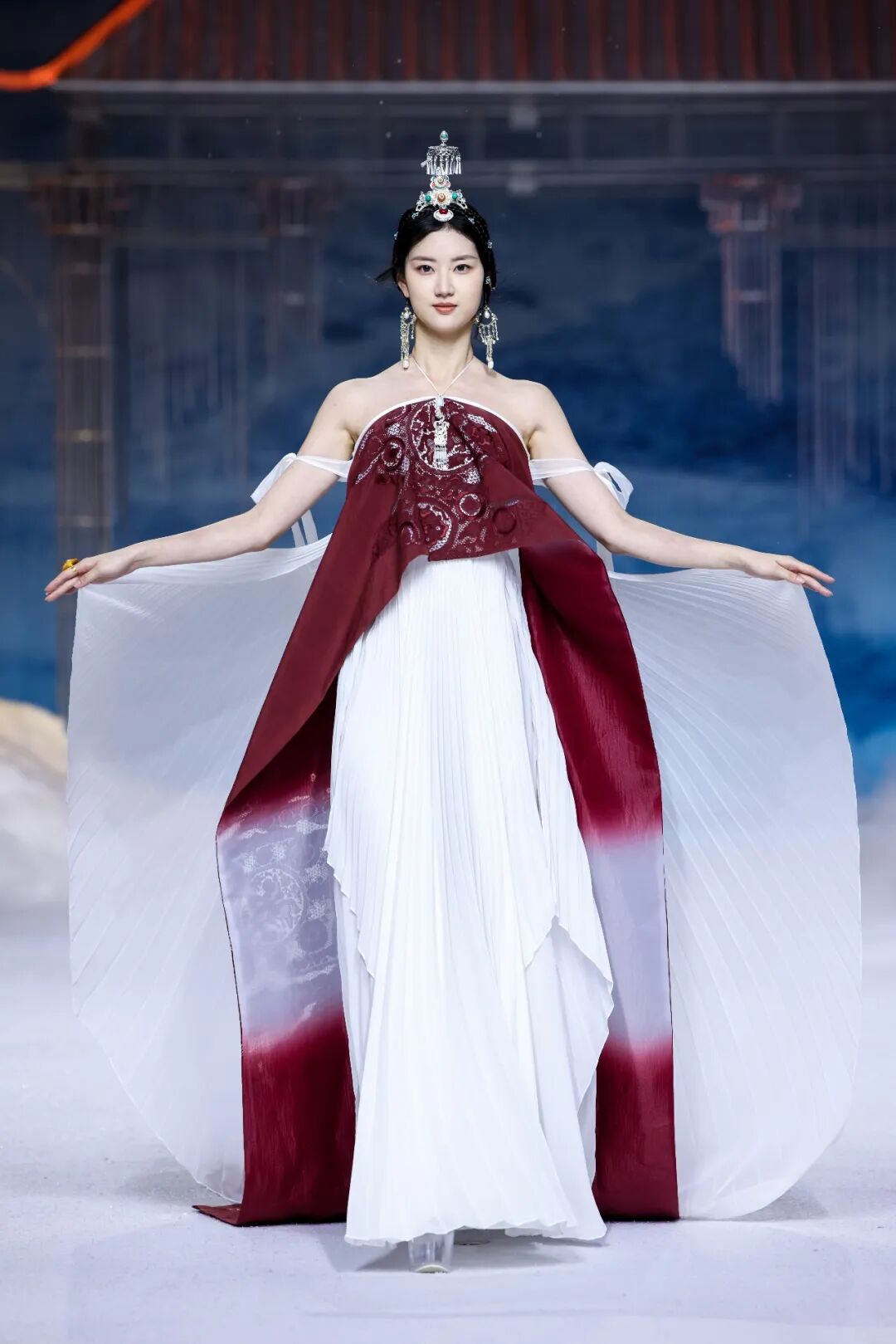 《雪域红殿》灵感源于布达拉宫,红白宫相映、鎏金宝顶,气势恢宏。汲取藏服制式的长袖,对襟,不对称斜裁,配以灵花、宝瓶、菱格等图样,金线钩绣,光彩夺目、神圣吉祥。