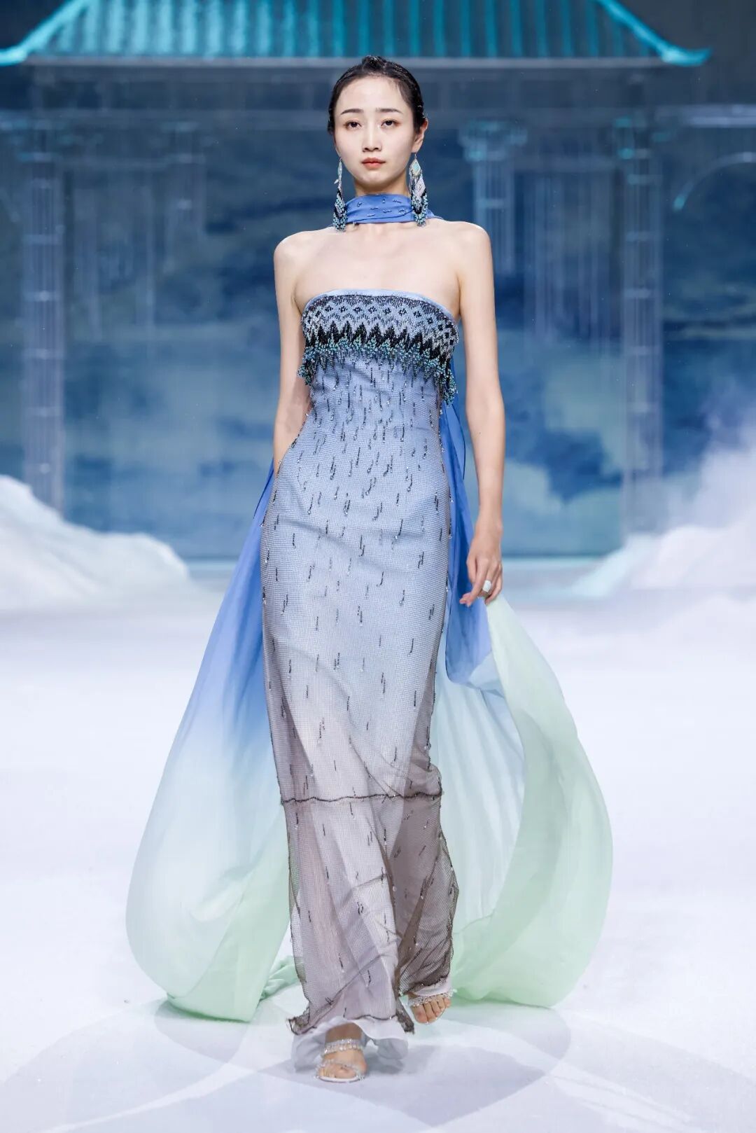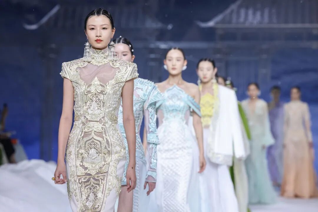 本次共发布16个服饰系列,展示近80套高定秀款服装。其中《万境·如境》灵感源于团花图腾及佛龛建筑骨架,融合云纹、莲花、曼陀罗等生灵图腾。手工渐变植物晕染绿色、橙色系东方丝纱,犹如霞光投射于裙摆之上,华彩夺目。