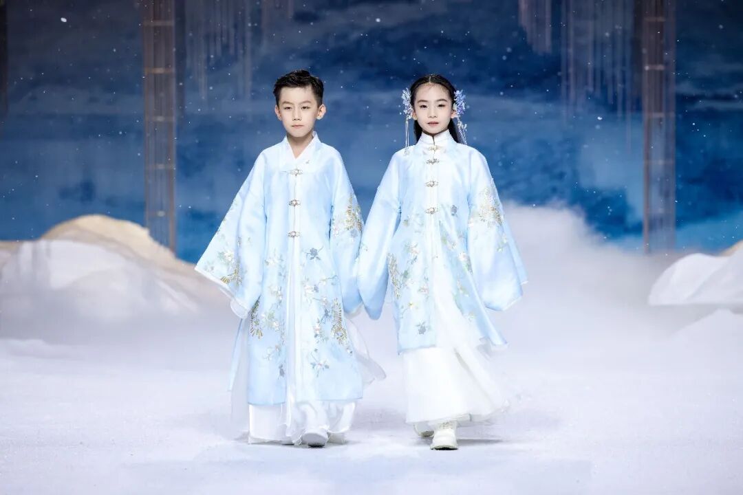 其中“齐氏三兄弟”齐显霆、齐浚廷、齐禹霆备受大家关注,三人身着服饰均以雪山金龙为设计灵感,仿若从云中走来。齐显霆身着一袭白衣映入大家的眼帘,其主色调灵感来源于雪域高原的纯净之白,在衣服的衬托下宛如云中仙君。齐浚廷身穿一袭长外套款款而来,衣服上的每一个纹样均采用宫绣高超的技艺,是匠心与时间的沉淀。齐禹霆身着金色龙纹服饰,金龙栩栩如生,仿佛下一秒便会腾飞而出。“齐氏三兄弟”最本真的童趣与天真,以及温馨互动,让大家体会到了来自家的温暖,小家大爱,最动人心。