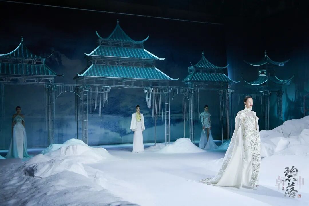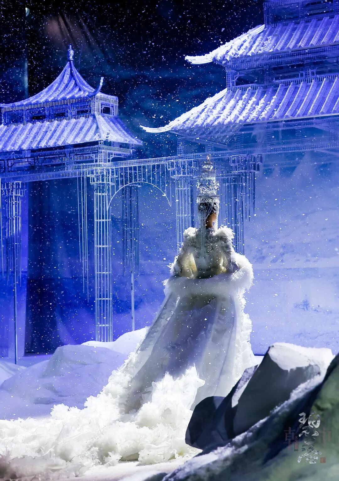 《云顶天宫》灵感源于幻想中飞升的云龙盘旋于冰晶般的宫殿庙宇之上,守护着一方纯净与圣洁。盘银龙于雪域白面料上,灵性优雅中把中国式的建筑和图腾表达的栩栩如生。