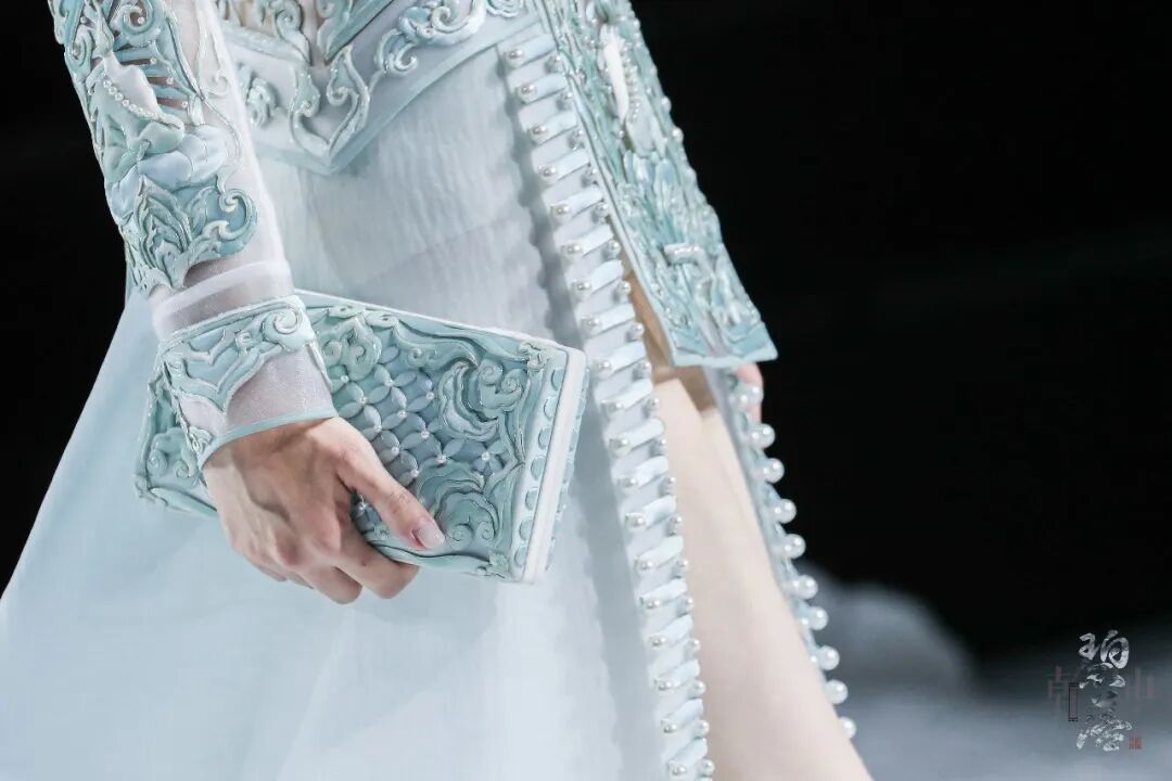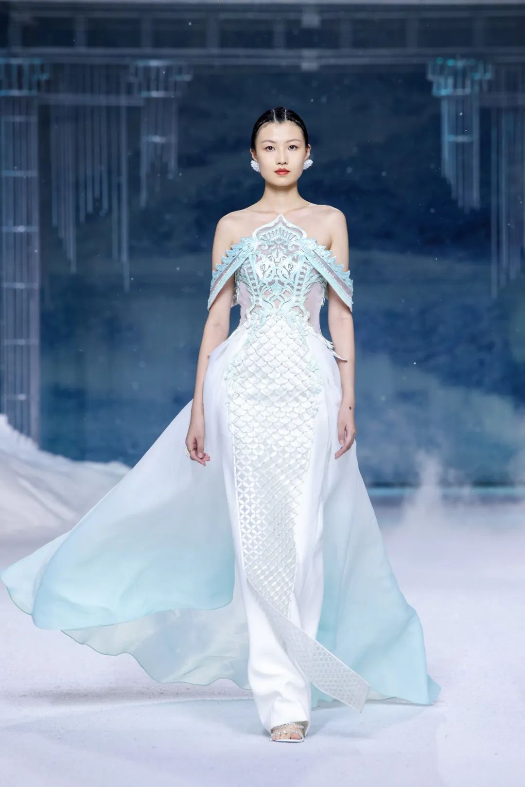 《若雪·初见》灵感源于雪中仙子。青碧色与雪白色的搭配,犹如仙境中的湖泊与冰山。珠饰雪花的形态脉络、花瓣结构剪裁,带人遁入雪花飘零的碧澈青空,如天外飞仙般梦幻飘逸。