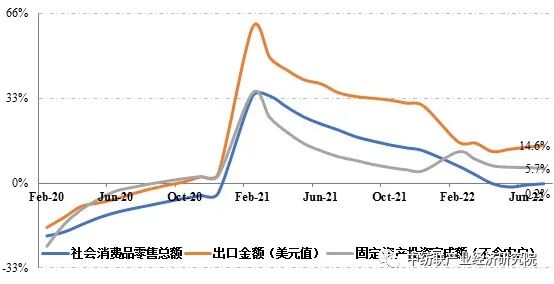面对需求收缩、供给冲击、预期转弱三大预期内压力和国内疫情、俄乌冲突两大超预期冲击,上半年我国GDP实现2.5%的增长,初步形成经济触底回升势头。7月以来,我国经济克服疫情汛情、高温天气波动影响,经济延续恢复态势,但回升基础仍需巩固。统计数据显示,1~7月全国社会消费品零售总额同比减少0.2%,出口总额(美元计价)同比增长14.6%,规模以上企业工业增加值同比增长3.5%,增速较上半年分别提高0.5、0.6和0.1个百分点;同期利润总额同比减少1.1%,增速较上半年下滑2.1个百分点。受疫情散点多发、高温多雨天气持续、川渝和长江中下游地区限电节电等因素影响,8月我国制造业PMI延续了7月以来弱复苏态势,虽较上月回升0.4个百分点至49.4%,但仍位于收缩区间。图2:我国GDP同比增速