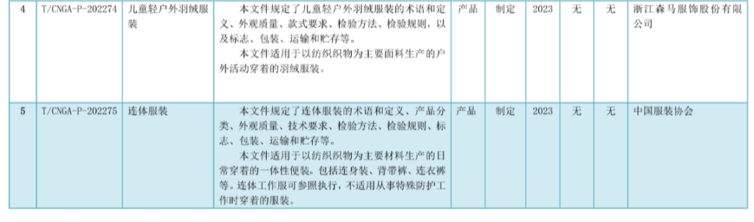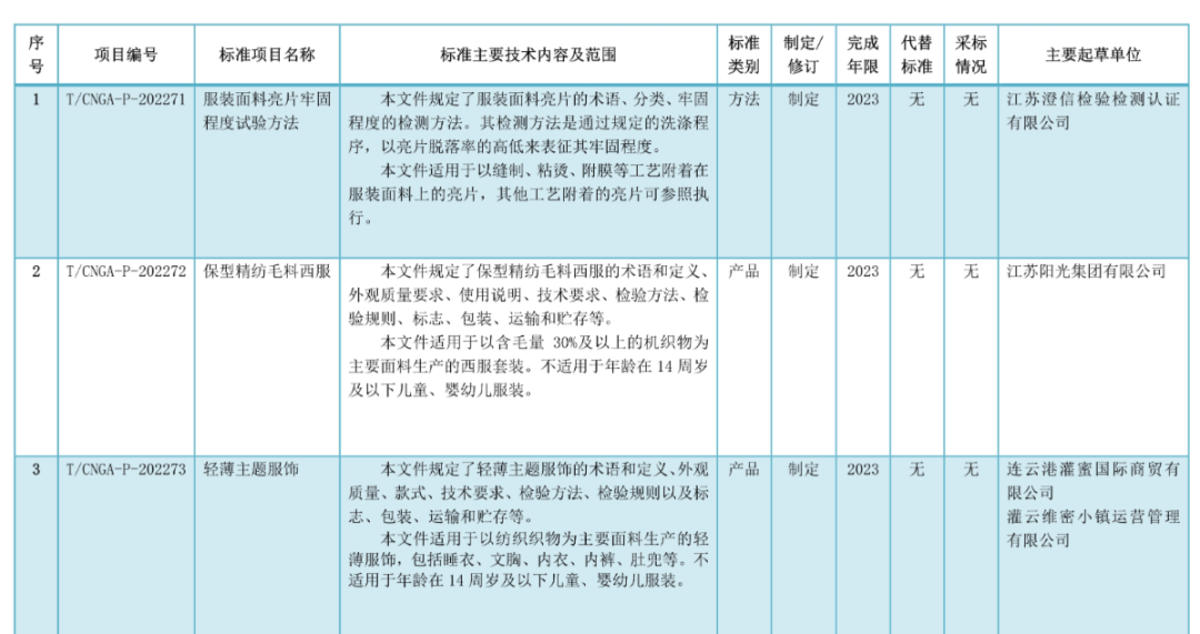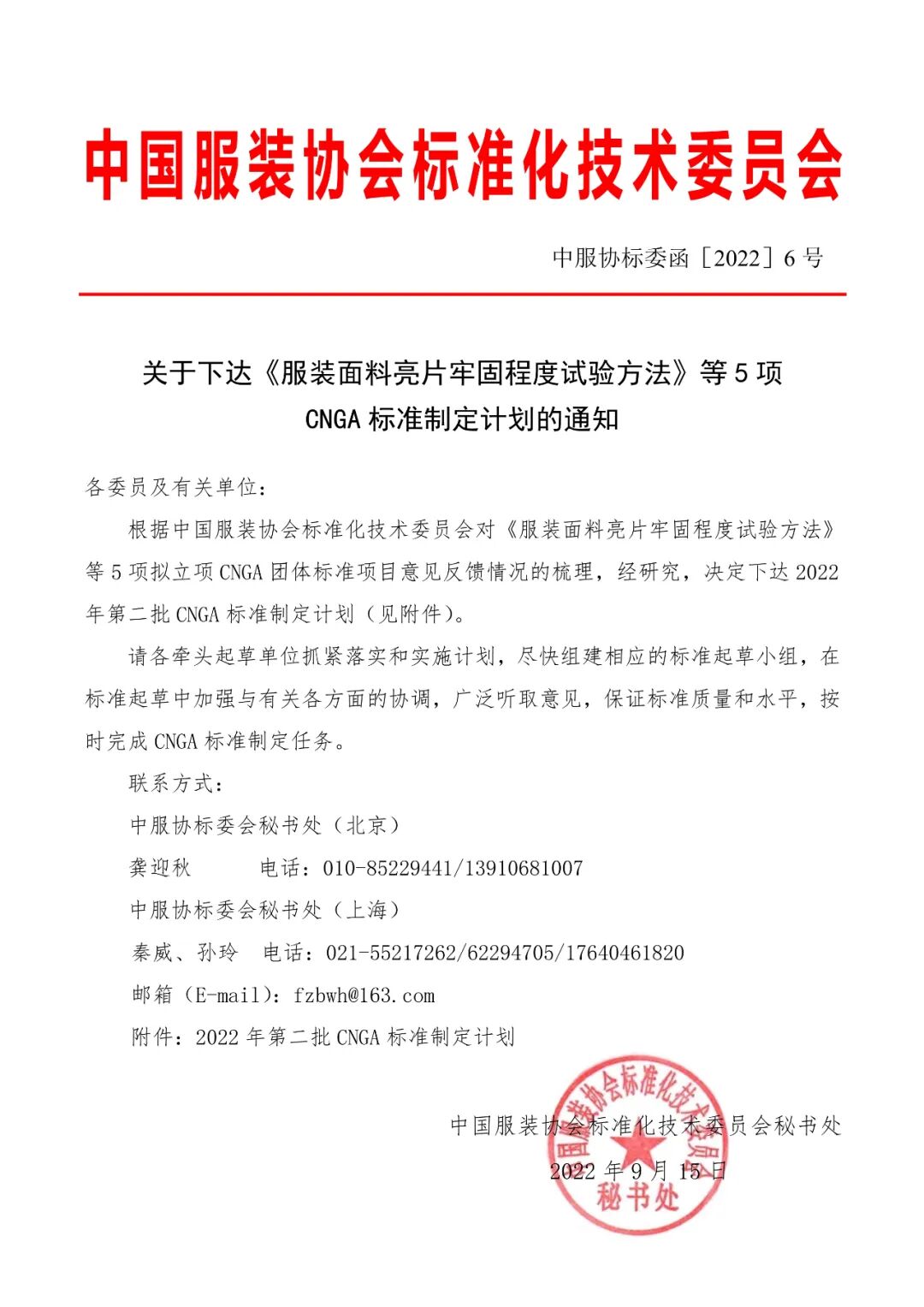 根据中国服装协会标准化技术委员会对《服装面料亮片牢固程度试验方法》等5项拟立项CNGA团体标准项目意见反馈情况的梳理,经研究,决定下达2022年第二批CNGA标准制定计划(见附件)。