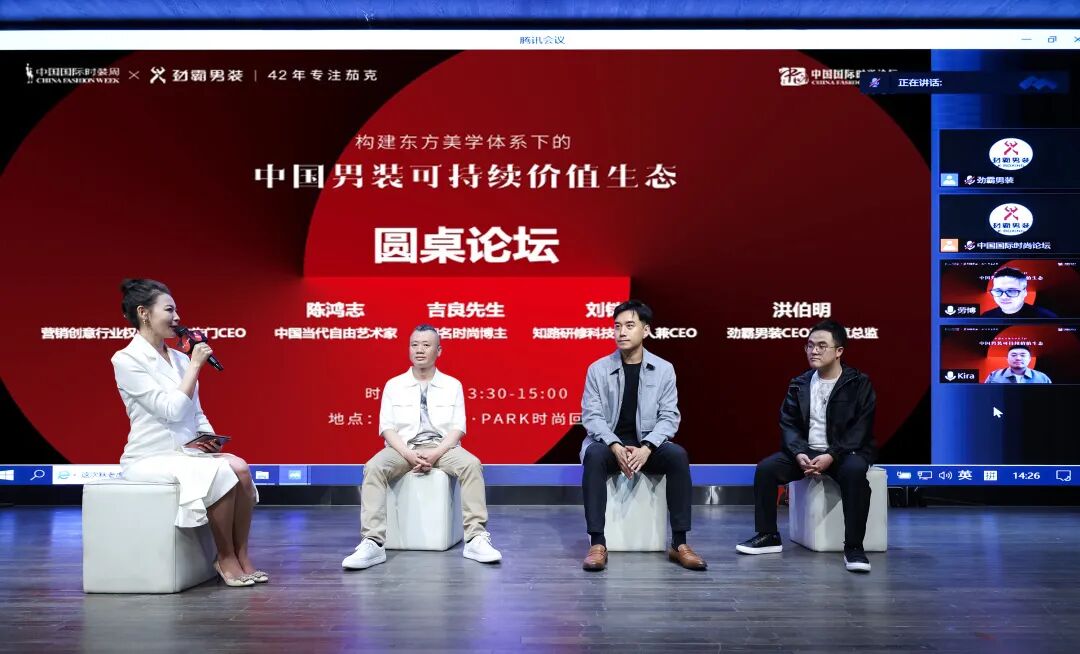 圆桌对话嘉宾:【从左至右】中国当代自由艺术家陈鸿志,知路研修科技创始人兼CEO刘铠文,劲霸男装CEO兼创意总监洪伯明,【连线嘉宾】营销创意行业权威平台广告门CEO劳博,知名时尚博主、时装评论人吉良先生