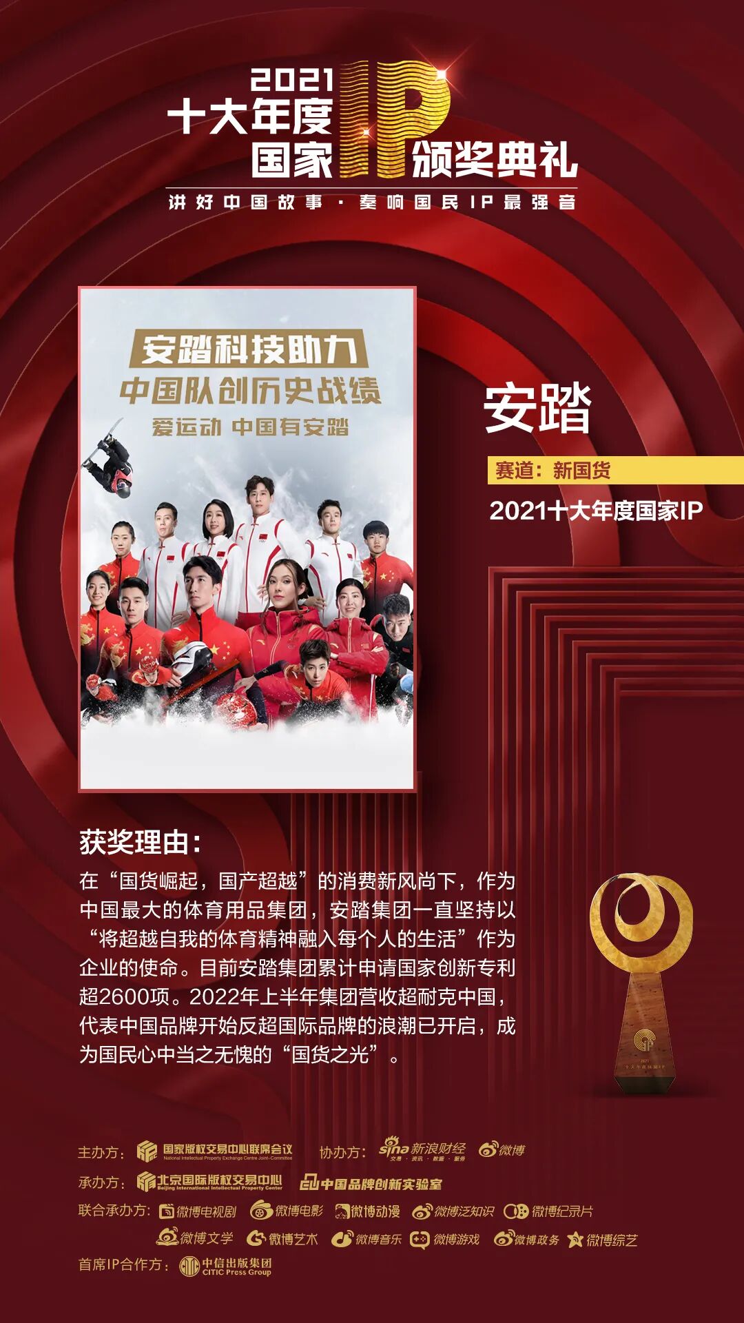 本次“2021十大年度国家IP评选”由版权领域专业评委、专业评审机构和网友参与票选的方式,以“创新性、传播性、引领性、民族性、艺术性、商业性”六个维度,从文学、影视、动漫、体育、原创设计等十个领域中评选中国优秀版权代表,为中国向知识产权强国迈进提供助力。对于安踏此次入选“2021十大年度国家IP”,主办方在颁奖词中表示,在“国货崛起,国产超越”的消费新风尚下,作为中国最大的体育用品集团,安踏集团一直坚持以“将超越自我的体育精神融入每个人的生活”作为企业的使命。目前安踏集团累计申请国家创新专利超2600项。2022年上半年安踏集团营收超耐克中国,代表中国品牌反超国际品牌的浪潮已开启,成为国民心中当之无愧的“国货之光”。作为唯一入选的服装品牌,安踏品牌副总裁&CMO朱晨晔表示,一直以来,安踏坚持“专业为本、品牌向上”,希望通过不断地科技创新为每一个爱运动的人带来更多更好的运动产品。作为中国奥委会的合作伙伴,安踏还逐步将奥运装备的同款科技应用于更广泛的大众产品。未来,希望安踏能够为更多消费者带来运动的快乐,助力全民健身热潮。值得关注的是,安踏集团2021年收入达493.3亿元,连续10年位列中国体育用品企业收入第一。今年8月23日,安踏集团发布的中期业绩显示,2022年上半年安踏集团实现收益259.65亿元,同比增长13.8%,超市场预期。2021年安踏体育发布5年战略规划,根据公司年报,安踏体育将以“专业为本”和“品牌向上”为重心,持续为中国国家队打造比赛装备、整合全球顶级运动科技研发力量、聚焦奥运会和跑步、篮球以及女子系列等,持续扩张在中国市场的份额。2022年的中报,安踏体育无疑交出一份漂亮的答卷,而在未来不断地更新迭代中,其能否取得更多突破,还要看接下来的市场表现。