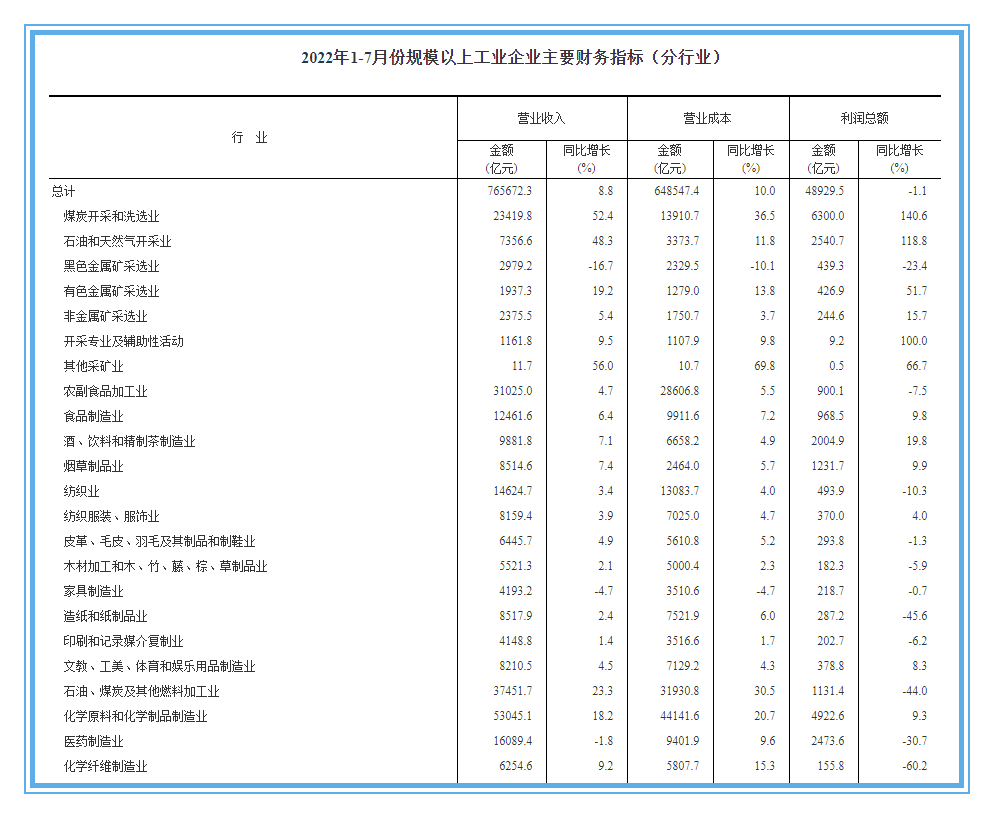 点击蓝字关注我们近日,国家统计公布的1-7月全国规模以上工业企业数据显示,1-7...