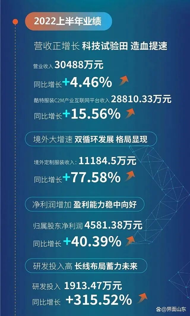 8月28日晚间,深耕C2M产业互联网的酷特智能披露2022年半年度报告。报告期内,公司实现营业收入30488万元,较上年同期增长4.46%;归属于上市公司股东的净利润4581.38万元,同比增长40.39%。而在这份业绩增速领先全行业的“期中成绩单”的背后,体现了酷特智能核心竞争力的进一步增强,即“C2M产业互联网平台生态”的战略目标取得显著成效。制造业是一个国家综合实力的根本,是立国之本、强国之基,从根本上决定一个国家的综合实力和国际竞争力。以智能制造为主攻方向推动产业技术变革和优化升级,已成为制造业企业发展的必然趋势。尤其,随着国家《“十四五”智能制造发展规划》的发布,智能制造已成为中国数字经济的新底座之一。作为传统制造业智能化转型的先行者, 酷特智能从初期从事成衣的生产和销售转为服装的大规模个性化定制。2011年,酷特智能正式将以“个性化定制”模式展开的C2M商业生态确定为公司发展战略;十年后,酷特智能在深圳证券交易所成功登陆A股创业板上市发行,成为中国C2M服装智能定制第一股。从最早提出C2M战略到完成数据驱动的大规模个性化定制生产模式的落地实践,酷特智能用了十余年时间,一举重塑了互联网时代的制造业逻辑。酷特智能聚焦C2M产业互联网平台生态战略,主要业务围绕酷特服装C2M产业互联网平台、酷特C2M产业互联网研究院、战略科技投资三大核心展开,致力于建设以“服装、科技、资本”三个核心支撑长期增长的科技创新企业。此外,酷特智能C2M产业互联网平台深度融合了互联网、物联网、大数据、云计算、人工智能、区块链等现代科技,需求导向,数据驱动,促进产业及跨产业的互联互通,数据资源有条件的共享、赋能,完全的市场共识机制,以区块链技术为支撑,系统集成,分级监管,协同联动,有效配置并高效利用资源,完美践行了“诚信、品质、创新、服务”的经营理念。根据中研普华研究院《2020-2025年中国服装定制市场现状分析及发展前景预测报告》数据显示,2022年我国服装定制市场规模将突破2600亿元。尽管服装定制的产业规模几乎保持几何级的增速,但就整个服装行业来说,定制依然只是一个小众领域。恰恰在这个小众领域,也是酷特C2M产业互联网平台的首个成熟的实践案例及落地场景。成果是行动最有力的证明,2022年上半年,酷特服装C2M产业互联网平台定制服装收入28810.33万元,同比增长15.56%,继续保持强劲增长势头。基于C2M大规模个性化定制模式,酷特智能的服装个性化品类已经涵盖了男女正装、休闲装、童装、风衣、大衣、单裤、夹克、毛衫、内衣、连衣裙、鞋子、皮具等全品类。日前,2022春季新品发布会暨第九期服装定制特训营上,酷特智能也一举发布了男装、女装、卫衣、T恤等品类的150余款新品。这意味着酷特智能通过产业互联网纵向新玩法,将服装产业的品类持续扩容。纵观此次“半年考”,更为重要的是,酷特智能积极推动海外市场开拓,为国外的服装品牌商、服装创业者、时尚设计师和服装经营者等B端产业客户提供服装定制和柔性化彻底解决方案。2022年上半年,酷特智能境外收入11184.5万元,同比增长77.58%。酷特智能以智能制造突破瓶颈短板,以版型数据库、款式数据库、工艺数据库、BOM 数据库等为核心的数据库系统,打破了服装界个性化与工业化的矛盾,真正实现了“一人一版,一人一款,一件一流,7个工作日交付”的大规模个性化定制,解决了传统服装库存的瓶颈以及传统个性化定制高成本、无法量产的痛点。当然,对于C2M产业互联网生态平台企业——酷特智能来说目光也不会只放在服装定制一个点上。服装定制只是酷特智能产业互联网的一个应用场景,凭借历经十余年创新实践创建的C2M产业互联网平台,酷特智能通过定制主业纵深布局、产业互联网跨界探索构筑了发展空间的无边界,形成多行业、多产业的平台生态,此前已经在医疗器械、化工、酒水、家纺、服装服饰等20多个行业进行了探索与实践。“十四五”时期,制造业企业全面普及数字化的现实需求愈发强烈。同时,数字化浪潮不仅席卷着行业企业,对企业的治理体系也提出了新要求,持续推动着园区治理、城市治理的全面改革。“我们希望酷特智能贡献给这个时代的价值,不只是智能工厂,还有全新的治理理念。”酷特智能创始人张代理这样说道。比较现代化生产的过程从来不是孤立和割裂的,生产过程的数字化,当然也离不开整个工厂管理模式的数字化。酷特智能以3000余人的自有服装工厂为试验室载体,用十多年的实践探索,建立了C2M产业互联网平台的核心能力,即智能制造、个性化定制解决方案和数字化治理体系;并以此为基础,成立了酷特C2M产业互联网研究院,致力于C2M产业互联网平台的核心技术研究和实践。通过规范化、标准化、体系化、数字化、平台化建设,酷特智能也实现了去领导化、去部门、去科层、去审批、去岗位等,完整建立了组织生态系统的方法论,还原人性,找回初心,实现了由人治到自治、从管理到治理的转变。事实上,通过数字化治理,酷特智能的工厂已经具有了自主能力,通过人机交互,可以进行数据采集、分析、判断、规划,并且在这个系统中,各组成部分可自行组成最佳系统结构,系统具备了自我学习、自行维护能力。值得一提的是,酷特C2M产业互联网平台及其数字化治理平台以客户