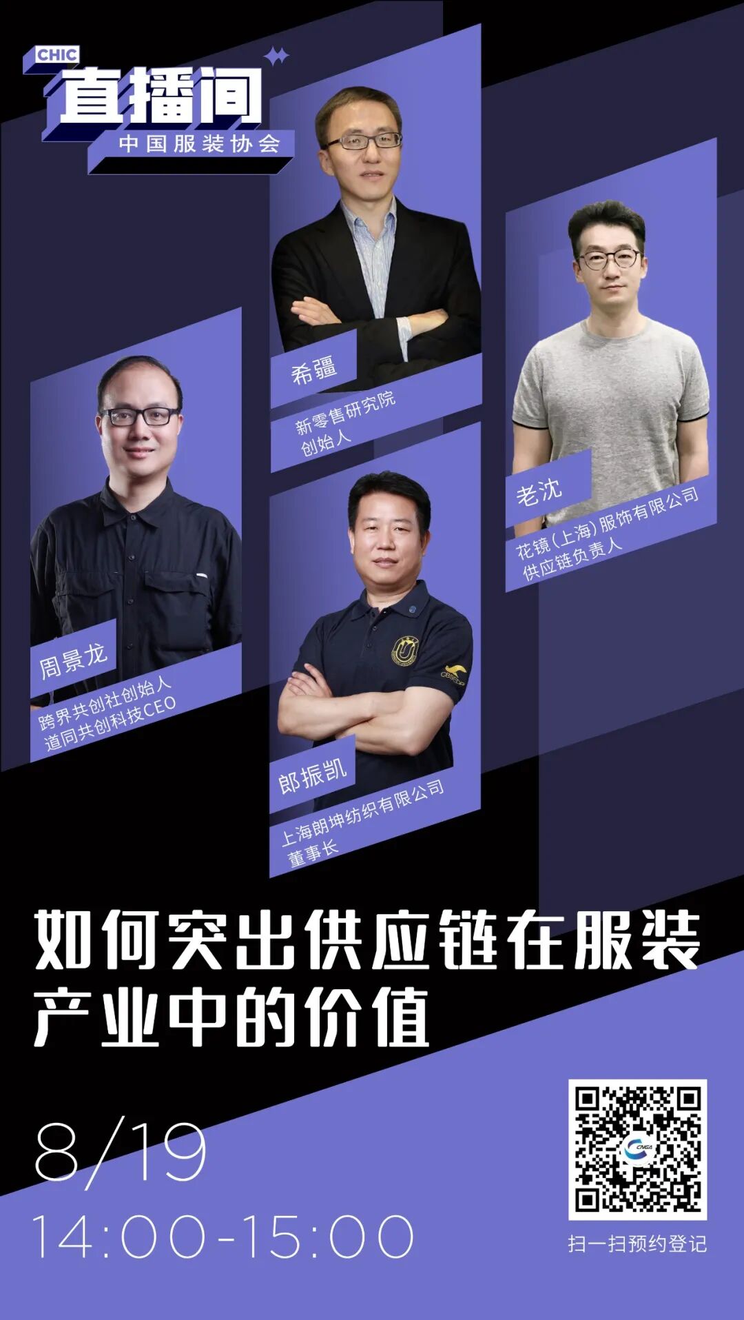 那么围绕服装供应链的一系列热点话题,本期CHIC直播间邀请到跨界共创社创始人、道同共创科技CEO——周景龙作为特邀主持,与特邀嘉宾新零售研究院创始人——希疆;企业代表上海朗坤纺织有限公司董事长——郎振凯;花镜(上海)服饰有限公司供应链负责人——老沈,就现阶段供应链企业所面临的挑战;服装供应链型企业自有品牌发展之路;企业的全域营销布局等话题与您共同探讨服装供应链企业的新价值。