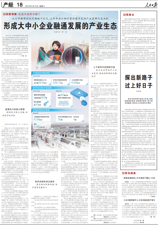 8月10日,《人民日报》深度观察栏目之“走进市场探冷暖”聚焦桐乡濮院镇,以整版形式刊发报道《从订单骤降到成交额破千亿元,上半年浙江桐乡濮院镇羊毛衫产业集群化危为机 形成大中小企业融通发展的产业生态》,全文如下:量大面广的中小企业是稳经济的基本盘。习近平总书记指出,要千方百计把市场主体保护好,激发市场主体活力,弘扬企业家精神,推动企业发挥更大作用实现更大发展,为经济发展积蓄基本力量。