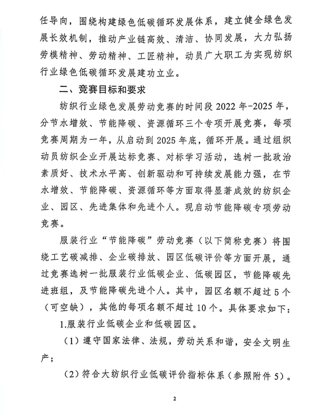 服装行业“节能降碳”劳动竞赛(以下简称竞赛)将围绕工艺碳减排、企业碳排放、园区低碳评价等方面开展,通过竞赛选树一批服装行业低碳企业、低碳园区,节能降碳先进班组,及节能降碳先进个人。其中,园区名额不超过5个(可空缺),其他的每项名额不超过10个。具体要求如下: