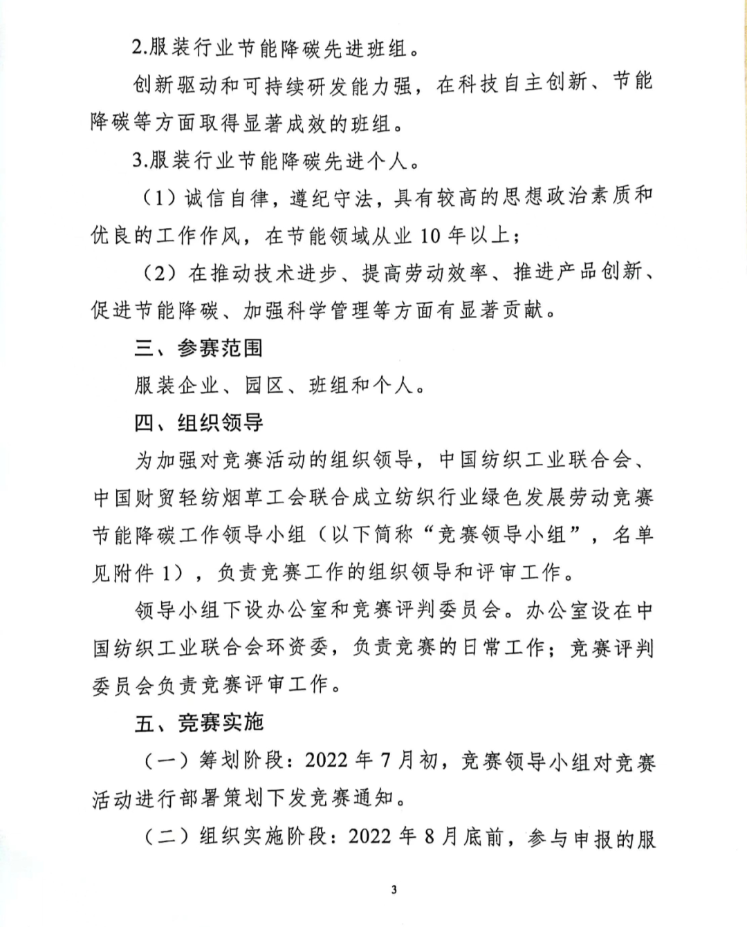 为加强对竞赛活动的组织领导,中国纺织工业联合会、中国财贸轻纺烟草工会联合成立纺织行业绿色发展劳动竞赛节能降碳工作领导小组(以下简称“竞赛领导小组”,名单见附件1),负责竞赛工作的组织领导和评审工作。