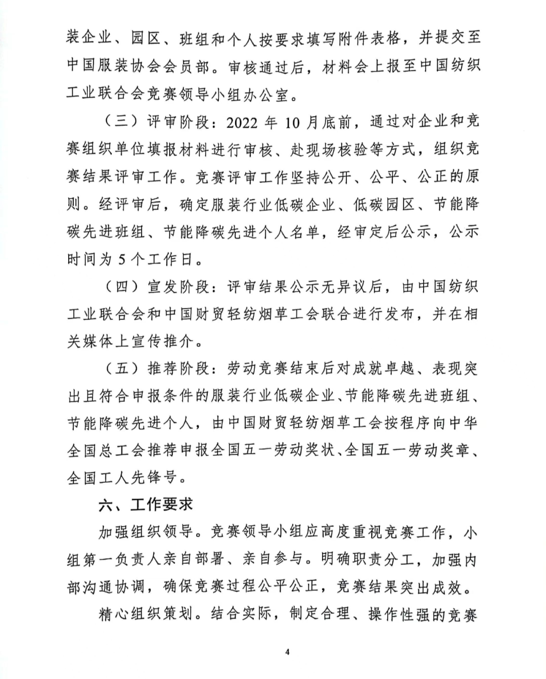 (五)推荐阶段:劳动竞赛结束后对成就卓越、表现突出且符合申报条件的服装行业低碳企业、节能降碳先进班组、节能降碳先进个人,由中国财贸轻纺烟草工会按程序向中华全国总工会推荐申报全国五一劳动奖状、全国五一劳动奖章、全国工人先锋号。