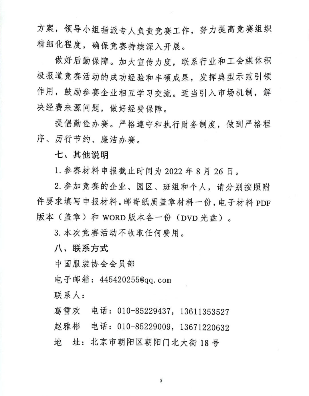 (二)组织实施阶段:2022年8月底前,参与申报的服装企业、园区、班组和个人按要求填写附件表格,并提交至中国服装协会会员部。审核通过后,材料会上报至中国纺织工业联合会竞赛领导小组办公室。