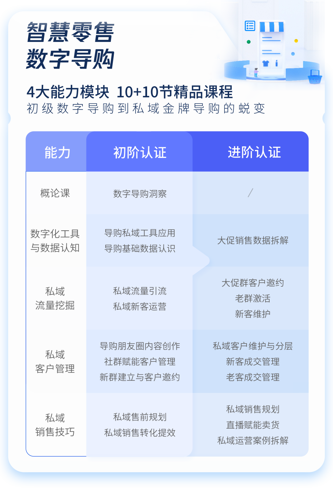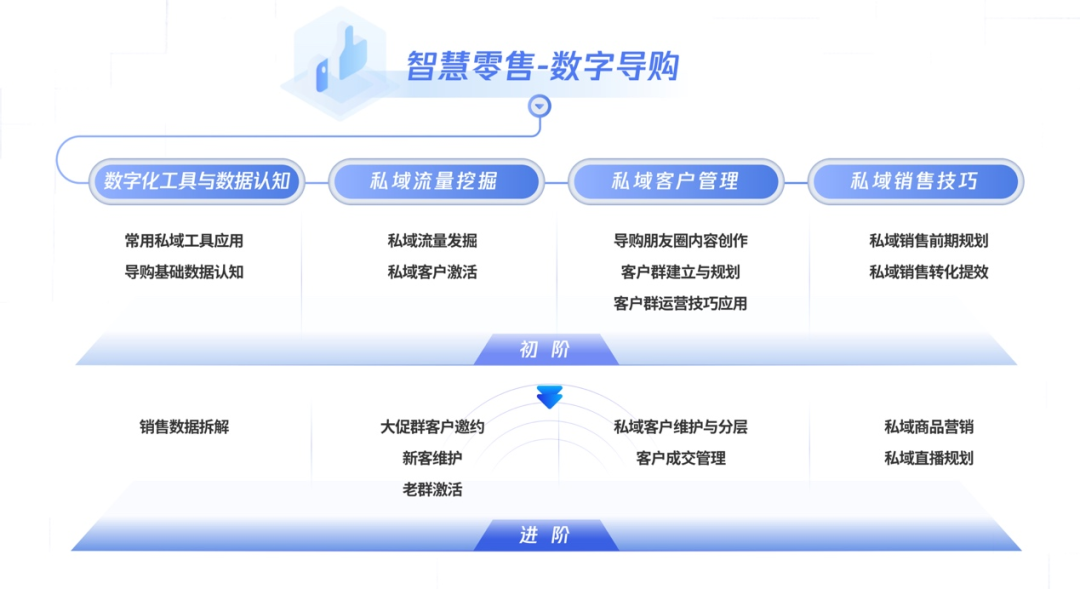 为满足数字导购的能力培养需求,智慧零售数字导购系列课程分为了数字化工具与数据认知、私域流量挖掘、私域客户管理和私域销售技巧4大能力模块,包含10节初阶课程和10节进阶课程,可助力导购人员实现能力全面提升。