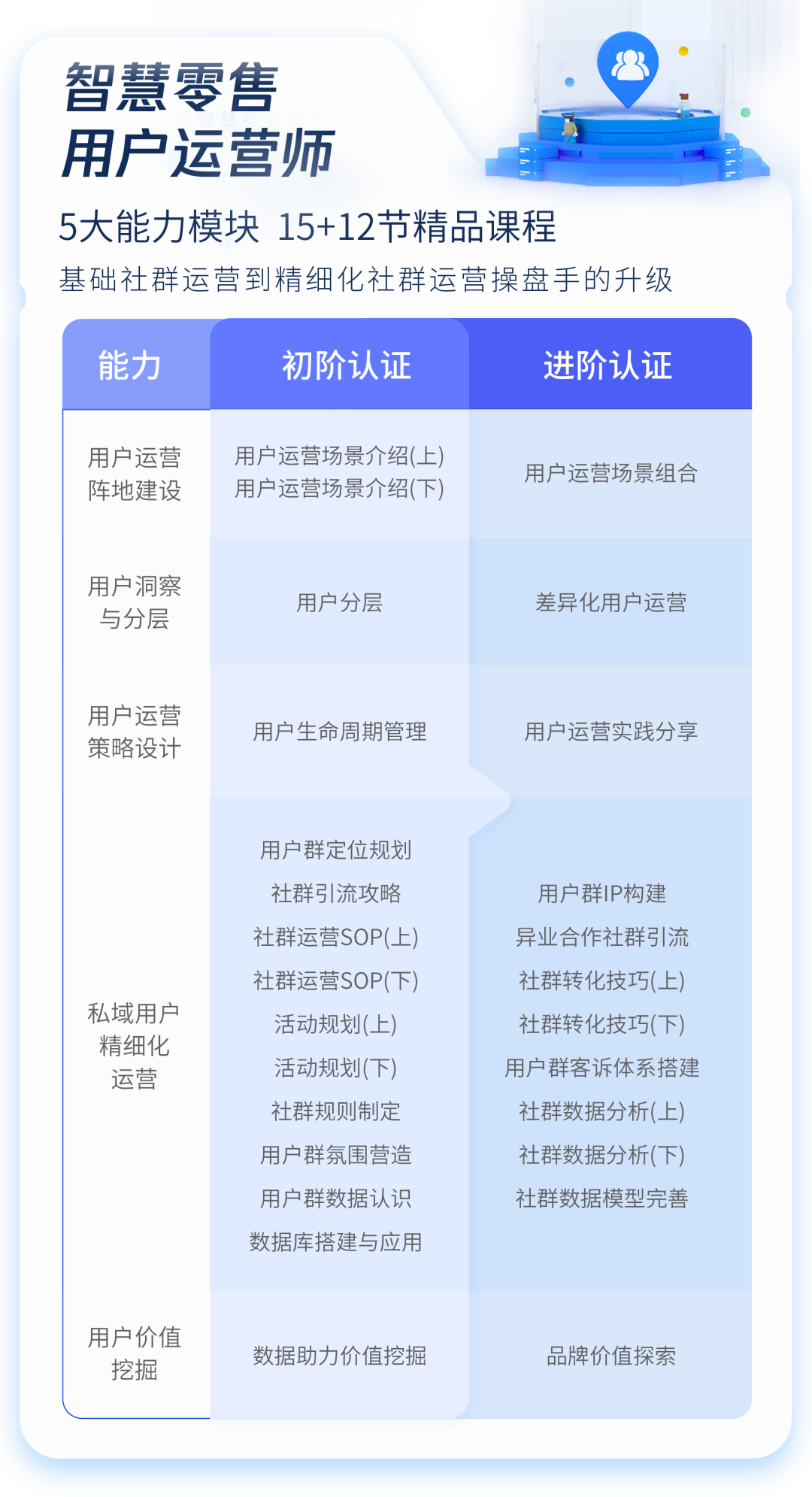 针对这些能力需求,用户运营师系列课程从用户思维底层逻辑出发,覆盖了用户运营阵地建设、用户洞察与分层、用户运营策略设计、私域用户精细化运营、用户价值挖掘5大能力模块,共包含15节初阶课程和12节进阶课程。