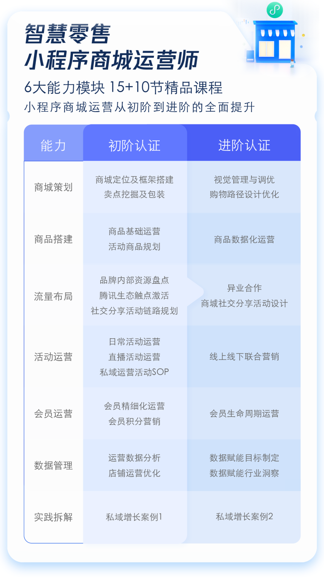 因此,智慧零售小程序商城运营师课程覆盖了商城策划、商品搭建、流量布局、活动运营、会员运营、数据管理6大能力模块,同时增加了私域案例拆解课程,让学员们在学习方法论的同时,能够理论结合实践,强化对于知识的理解和运用。该体系课程共包含15节初阶课程和10节进阶课程,建议小程序商城运营相关学员学习。