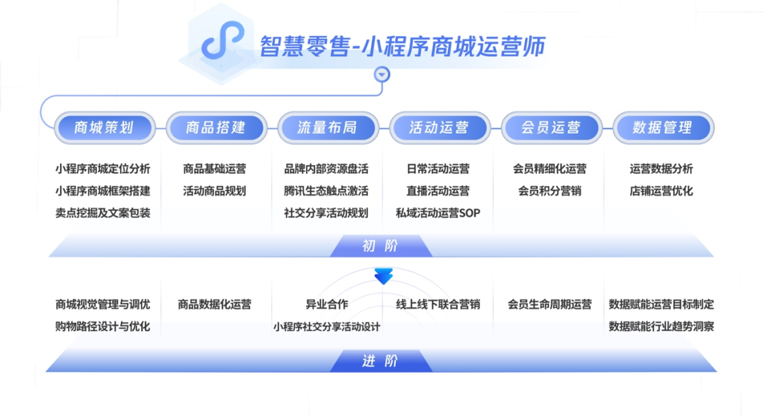 针对行业私域人才紧缺与专业化要求日增的问题,腾讯智慧零售私域人才认证计划应运而生。该计划紧密结合招聘端与一线实际运营洞察,围绕小程序商城运营、用户运营和数字导购制定了完善、立体的能力模型,并根据相应的人才要求,开发出理论结合实践的定制化课程。同时,腾讯智慧零售还将依据学习与考试成果为学员授予初阶和进阶两个级别的认证。学员须先完成初阶课程学习并通过考核认证,方可开启下一阶段的学习。