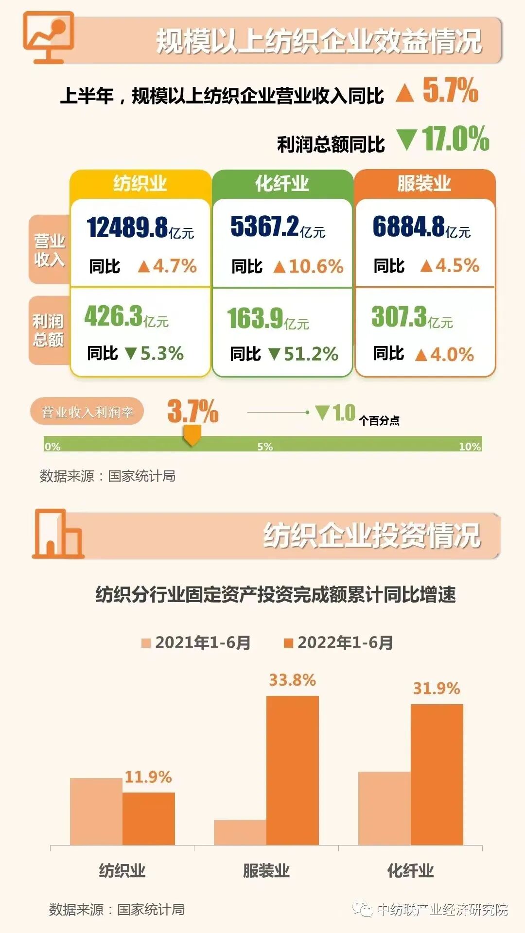 1-6月份,规模以上工业企业中,国有控股企业实现利润总额14894.5亿元,同比增长10.2%;股份制企业实现利润总额31977.9亿元,增长6.7%;外商及港澳台商投资企业实现利润总额9814.1亿元,下降13.9%;私营企业实现利润总额11885.7亿元,下降3.3%。规上工业企业实现营业收入65.41万亿元,同比增长9.1%;发生营业成本55.29万亿元,增长10.2%;营业收入利润率为6.53%,同比降0.52个百分点。规上工业企业每百元营业收入中的成本为84.52元,同比增0.84元;每百元营业收入中的费用为7.95元,同比减0.52元。根据海关总署统计快讯,今年上半年,全国纺织品服装出口1564.9亿美元,同比增长11.7%(以人民币计同比增长10.8%)。其中,纺织品出口763.2亿美元,同比增长11.3%(以人民币计同比增长10.3%);服装出口801.7亿美元,同比增长12.0%(以人民币计同比增长11.2%)。今年上半年中国纺织服装出口在2021年高基数的基础上继续保持稳步增长,其中服装出口增长尤为迅速。支撑出口增长的主要因素有:一是国际市场需求相对稳定。虽然新冠肺炎疫情和外部环境风险增多,但市场需求没有出现大幅下滑。二是国内生产韧性强、潜力足。在积极的稳增长政策推动下,保证供给充足,为出口增长提供有力支撑。三是部分区域在疫情冲击下迅速复工复产,有力稳住了外贸基本盘。长三角、珠三角克服疫情影响,外贸出口增速在短期内由负转正,展现了地方外贸发展的强大动能。此外,国际大宗商品价格高企也在一定程度上拉动了出口值的增长。