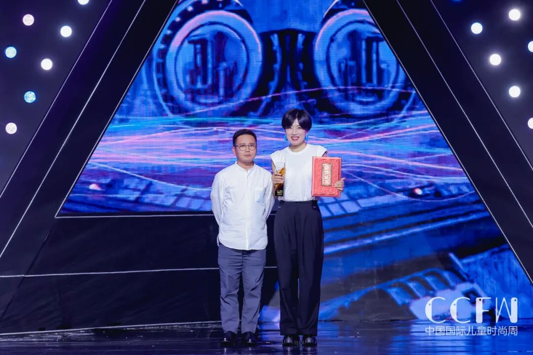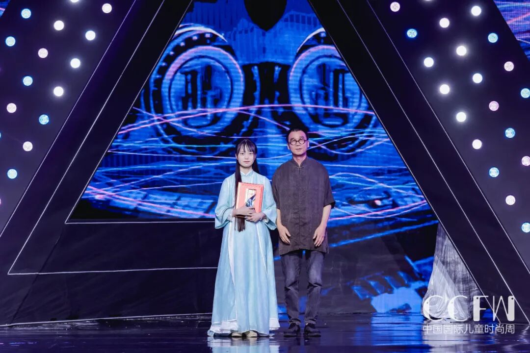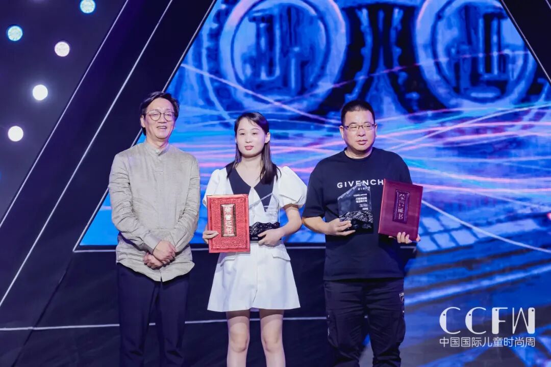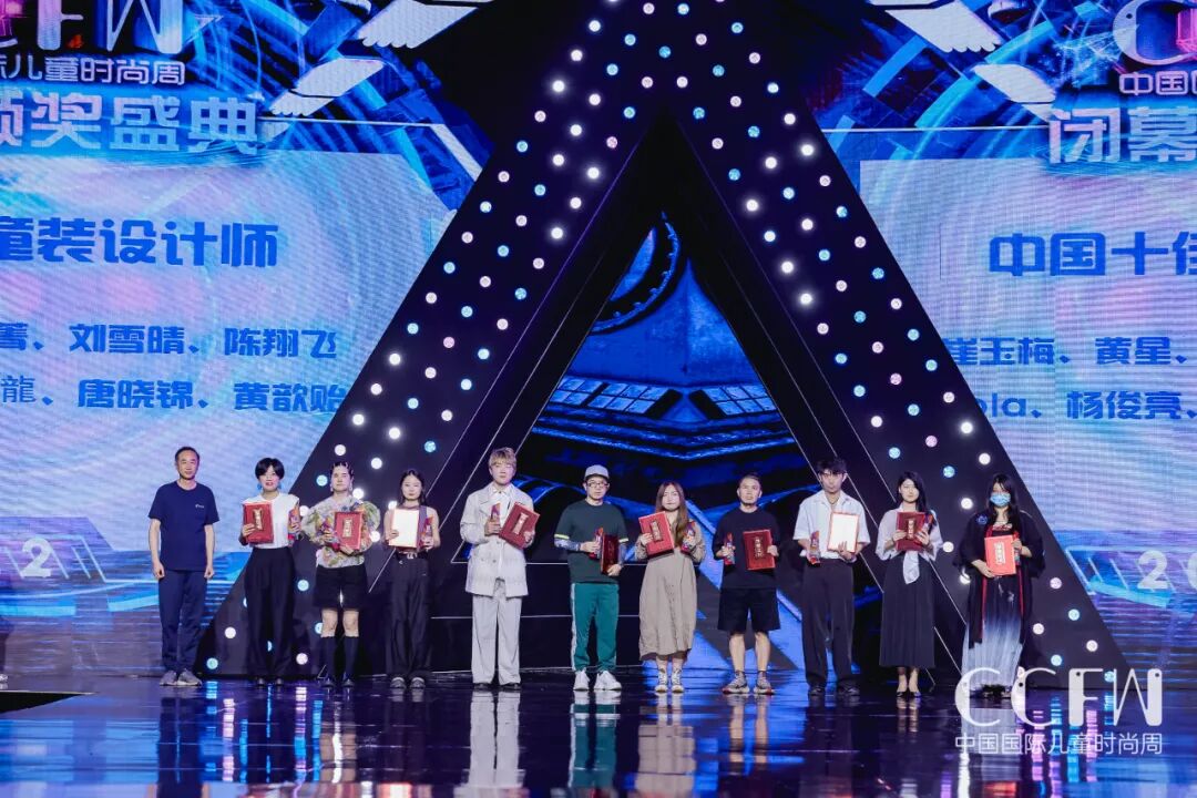 崔玉梅、黄星、房菁、刘雪晴、陈翔飞、Cola、杨俊亮、大龍、唐晓锦、黄歆贻获得2022CCFW中国十佳童装设计师称号,浙江理工大学学术委员会副主任、浙江省丝绸与时尚文化研究中心主任李加林为获奖设计师颁奖;