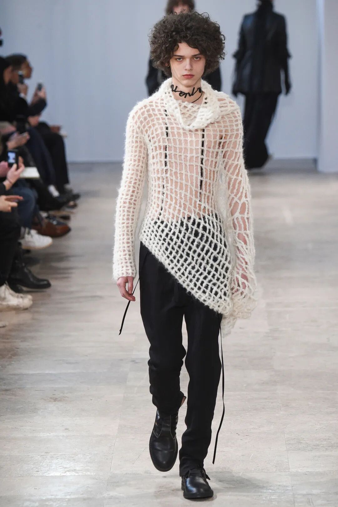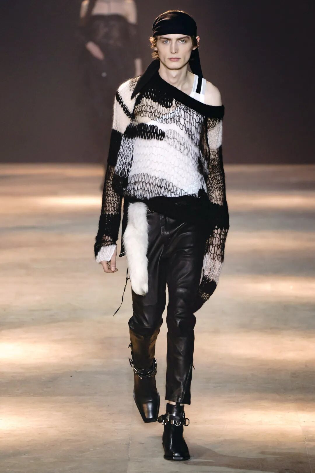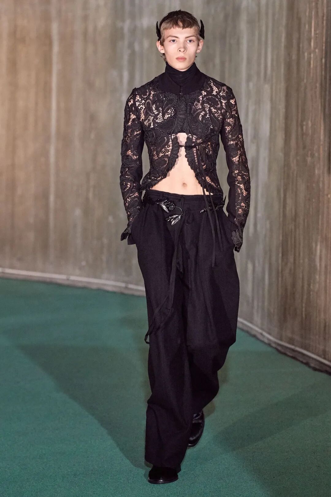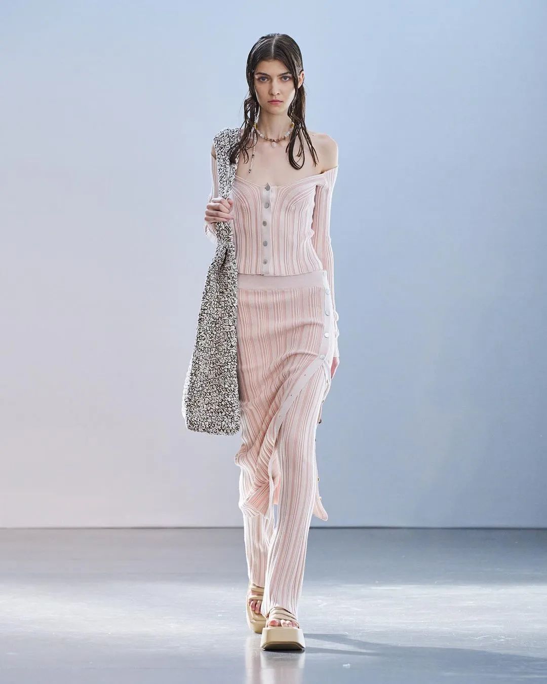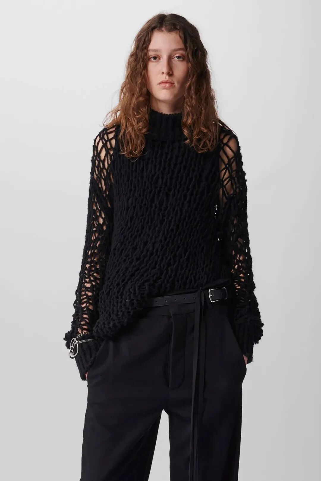 针织衫设计大量采用不对称造型、破洞细节表现颓废破败的暗黑美学风格,同时精致的凹凸肌理和半透明质感突显了服装的细腻与浪漫诗意。