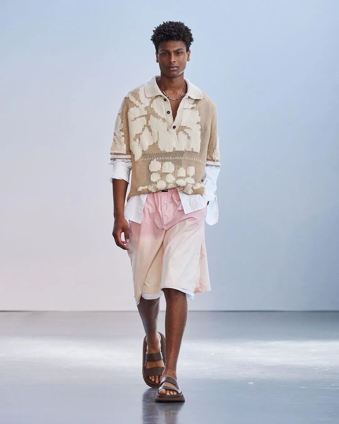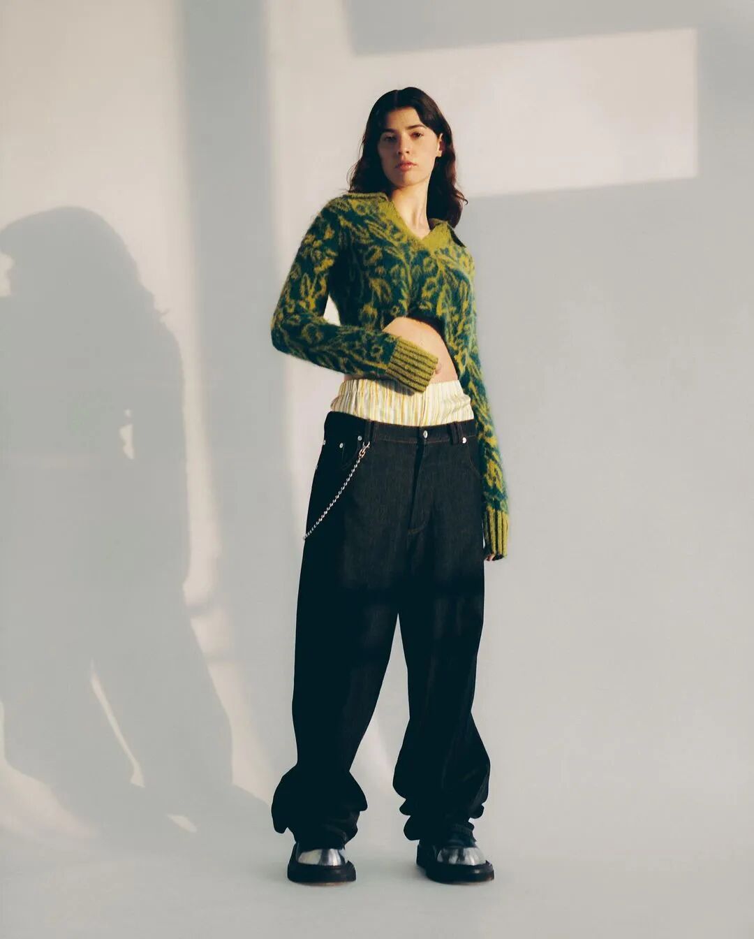 针织设计中,运用提花工艺表现简约又风格独特的罗马涅植物纹样,浪漫迷人。晕染的渐变效果让针织衫平添了一丝随性洒脱,斑驳的面料质感与随机性的拼接设计让系列设计更为松弛自然。