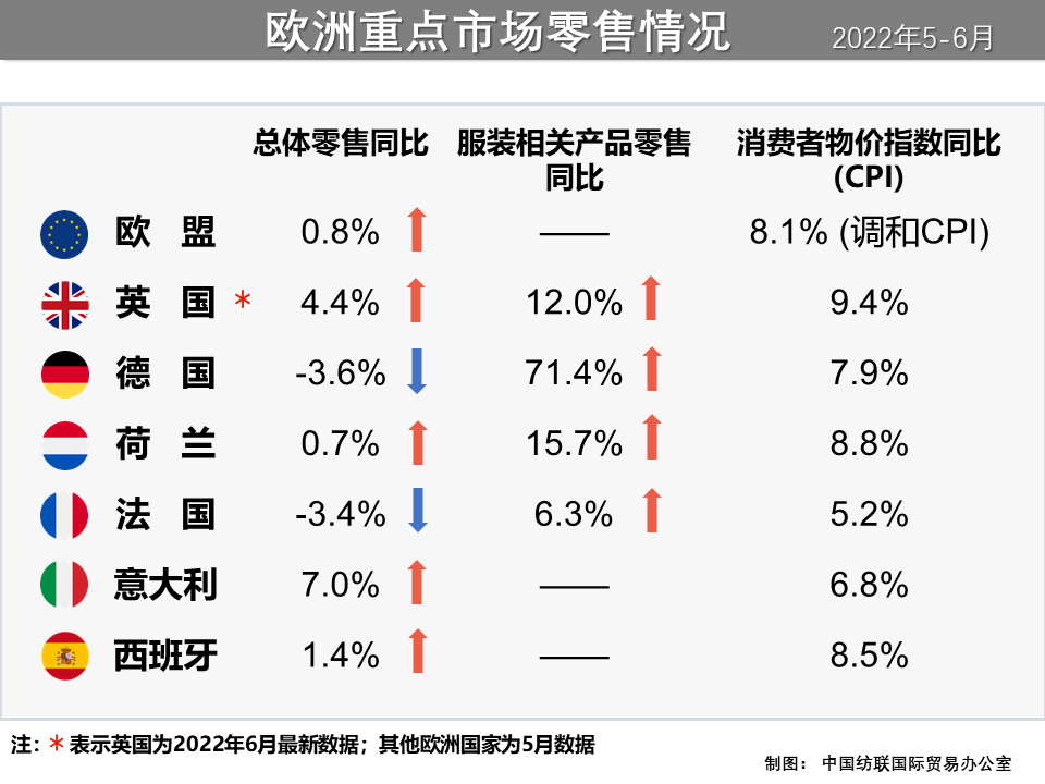 6月,欧元区通胀在能源价格持续飙升的影响下上行至8.6%,到达历史高位;英国、法国、意大利等国通胀率也一路上涨。官方数据显示,5月起欧洲各国服装类产品零售增速开始放缓,上年同期的低基数效应逐步减弱。