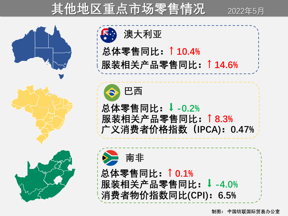 5月,受俄乌冲突和美国利率上升影响,南非CPI同比增长6.5%,达到自2017年以来最高水平。当月,南非纺织品服装鞋类和皮制用品零售额为160亿兰特(约9.7亿美元),为今年以来月销售最好成绩,但同比下降4%,5个月来首次增速转负。目前,南非国内正在进入第五波新冠疫情高峰期,加之极端天气和气候灾害频发,或将对南非的消费复苏造成极大影响。