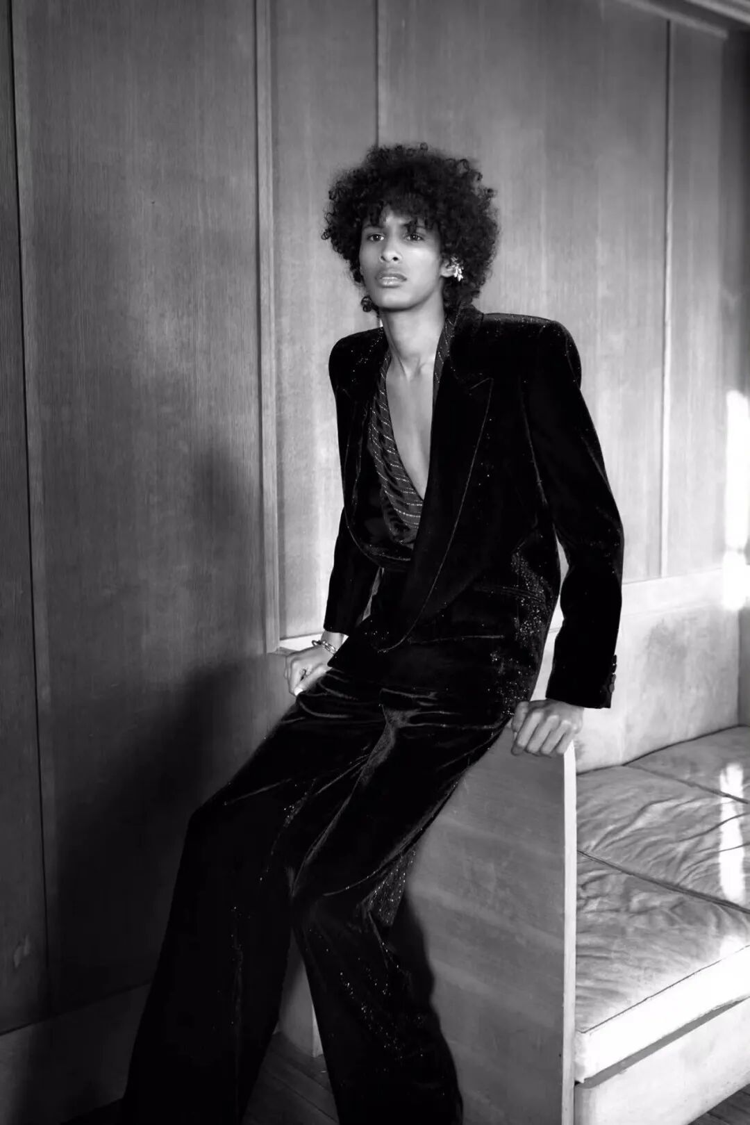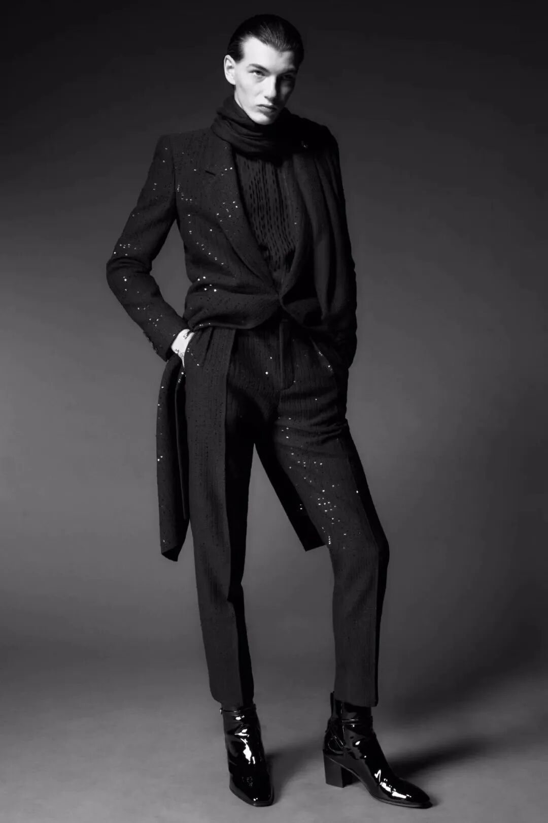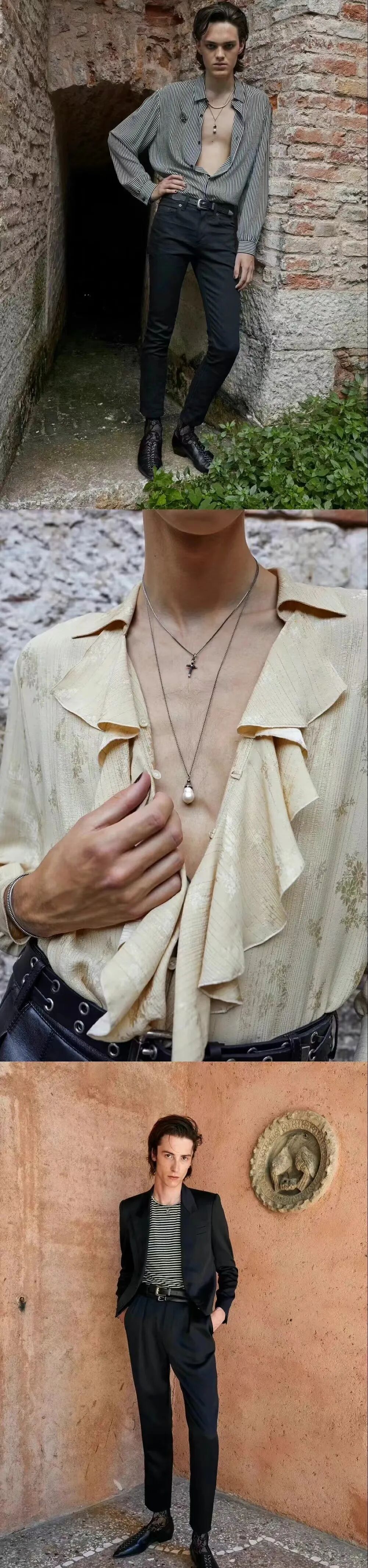Saint Laurent 对 Marcel Proust 作品的热爱,纤美线条和轻盈宽松的轮廓,柔和男性气质和哥特式风格贯穿造型,体现了设计师对传统剪裁和现代男装表达方式的探索。