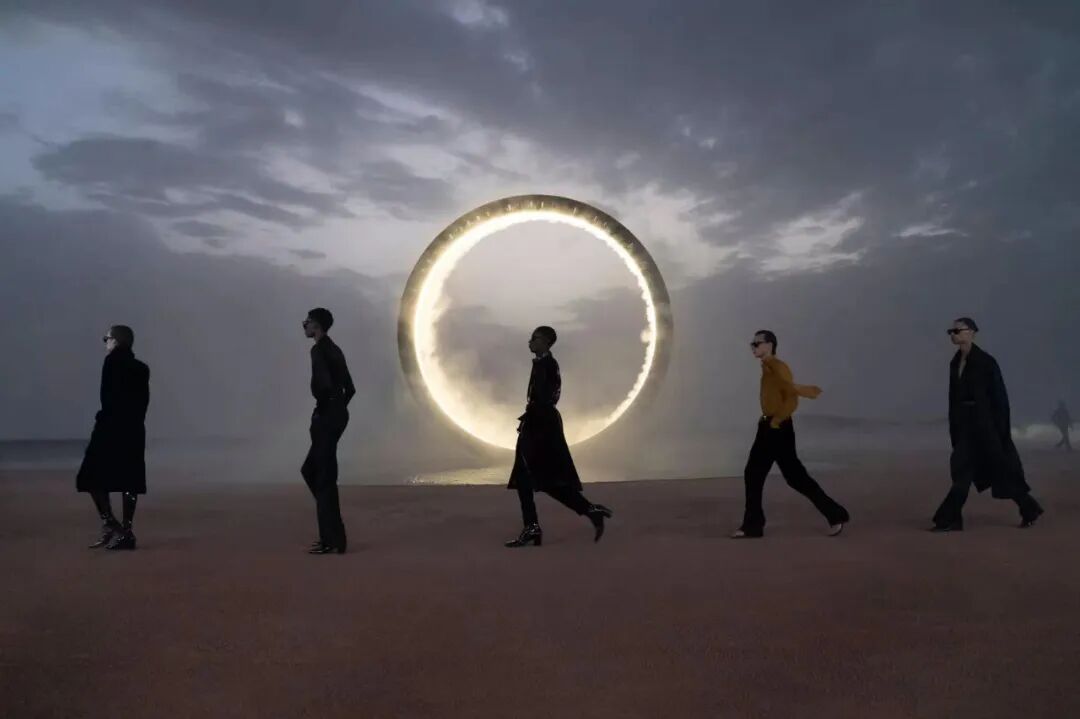 现场由艺术家和布景设计师 Es Devlin装饰 打造了圆形灯光,为沙漠营造艺术又浪漫的氛围。本季大秀的布景是为了向摩洛哥的宏伟之美致敬,灵感来自保罗·鲍尔斯(Paul Bowles)1949年的小说《遮蔽的天空》(The Sheltering Sky),与伦敦艺术家及舞台设计师Es Devlin合作。