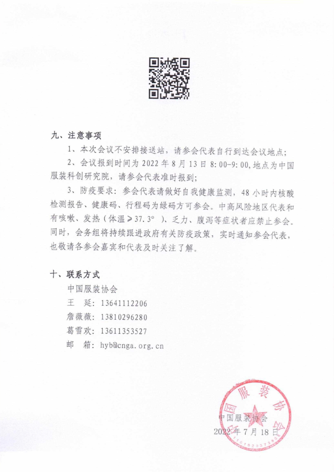 2、会议报到时间为2022年8月13日8:00-9:00,地点为中国服装科创研究院,请参会代表准时报到;