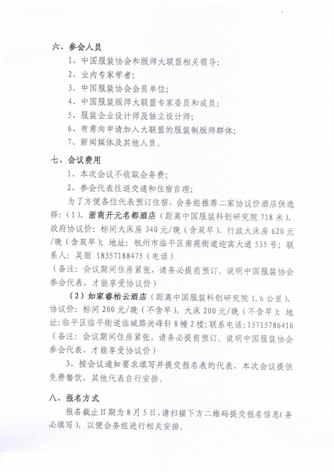 为了方便各位代表预订住宿,会务组推荐二家协议价酒店供选择:(1)、浙商开元名都酒店(距离中国服装科创研究院718米),政府协议价:标间大床房340元/晚(含双早),行政大床房620元/晚(含双早);地址:杭州市临平区南苑街道迎宾大道535号;联系人:吴丽 18357188475(电话)